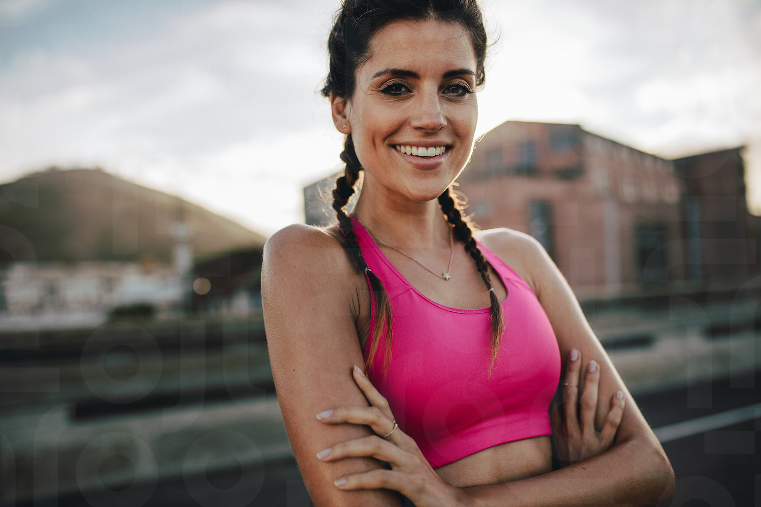 Healthy young female runner standing outdoors in morning. Woman in sports wear looking at camera with her arms crossed, relaxing after workout session.