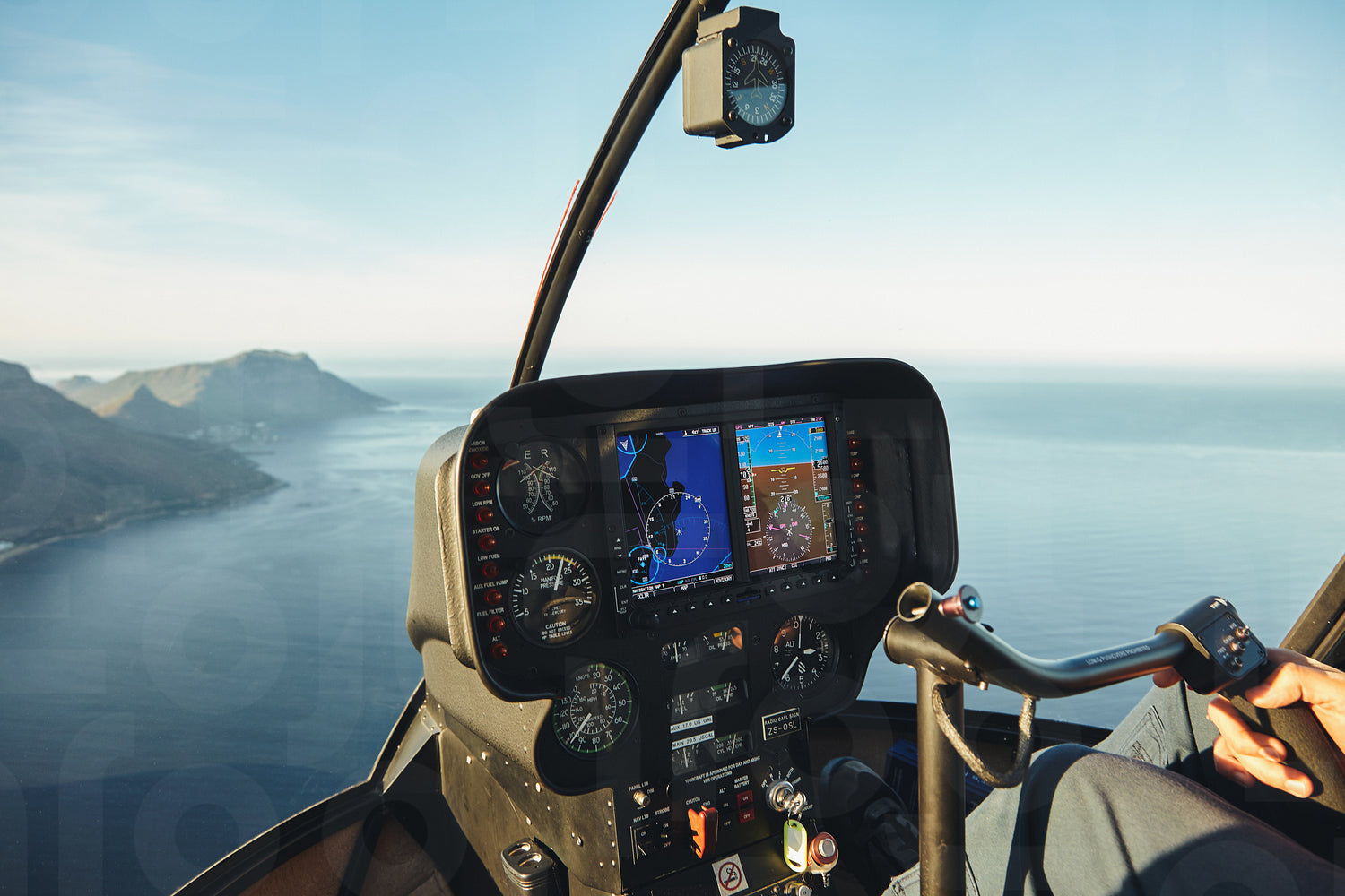 Instruments panel of a helicopter cockpit flying over the sea. Interior of helicopter control dashboard
