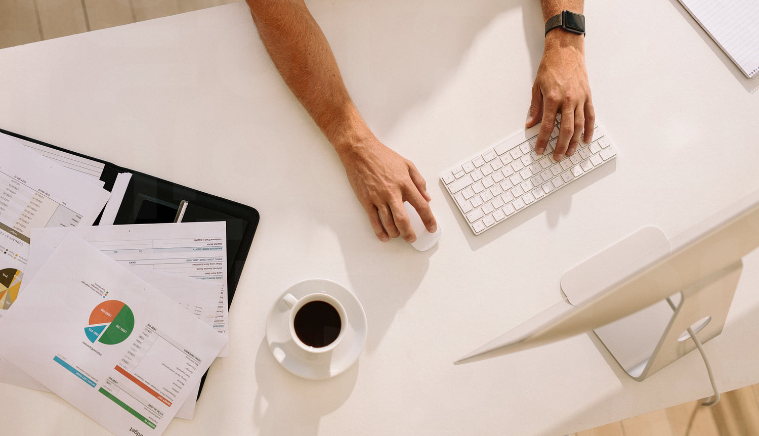 Top view of a man working on computer with documents and a cup of coffee on the table. Man using wireless keyboard and mouse while working on computer.