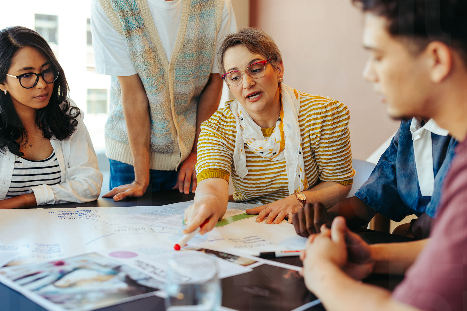 High school students engage in a collaborative classroom setting with their teacher, focusing on a group project discussion and brainstorming session.