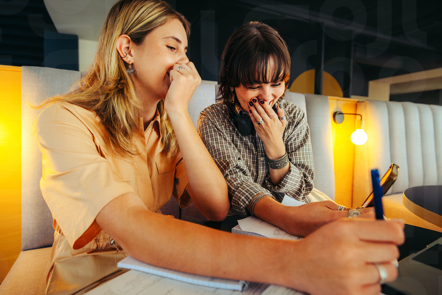 High school students sharing a laugh in a library setting while studying, showcasing friendship and happiness in an educational environment.