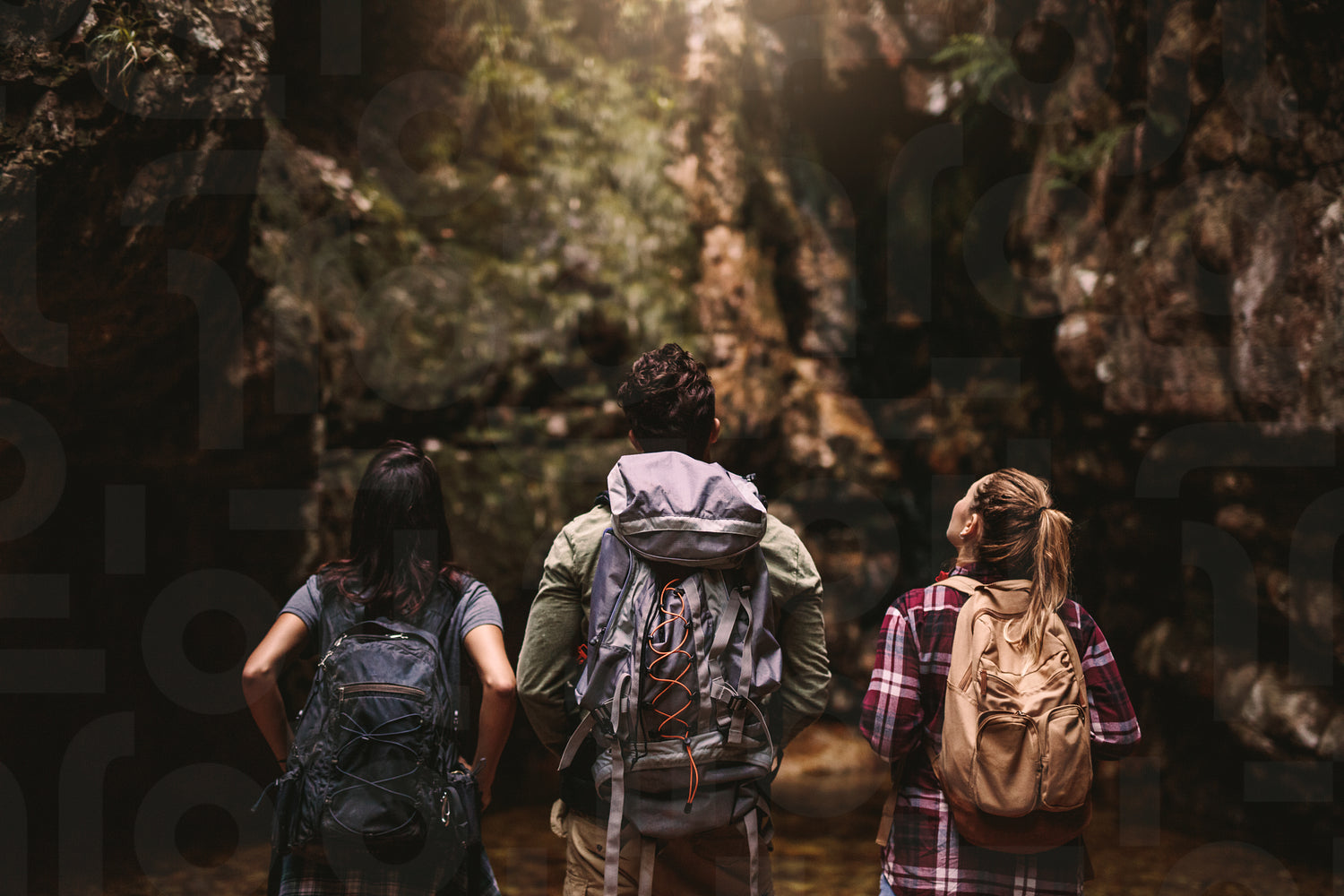Rear view of three young friends with backpack looking away at mountain view. Group of young people hiking in nature looking at a view.
