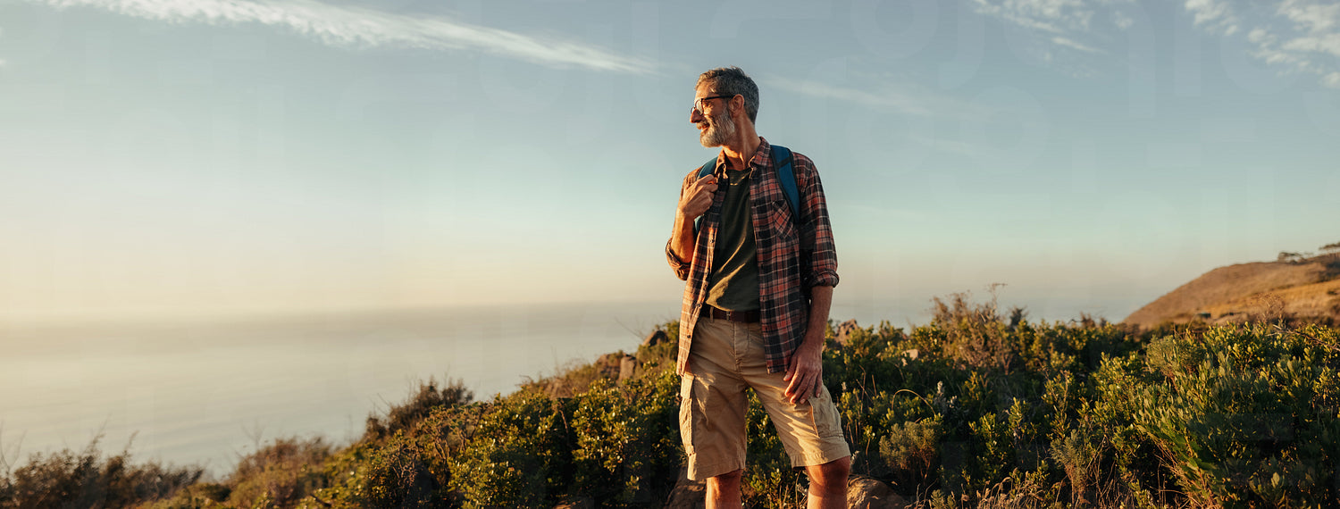 Hiking at sunset. Happy mature hiker looking away with a smile on his face while standing on top of a hill with a backpack. Adventurous male backpacker enjoying a hike near the sea.