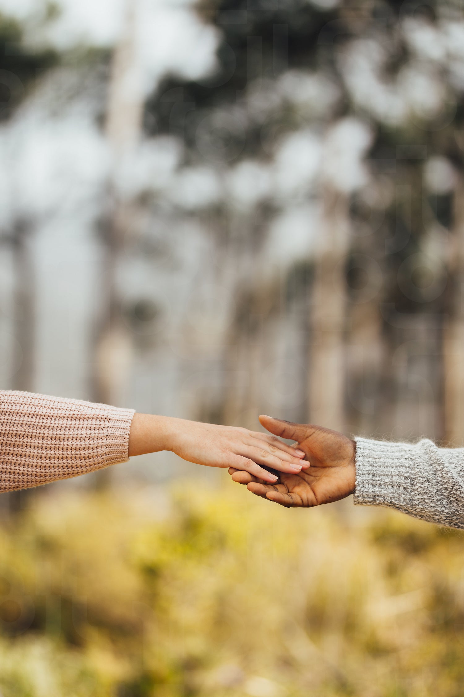 Interracial couple hands reaching to each other outdoors. Couple approaching to each other and holding hands.