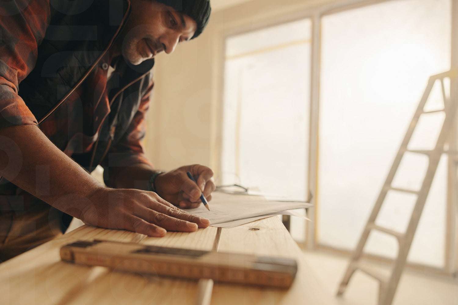 Home designer marks blueprints indoors, planning a kitchen renovation. Skilled and focused, he draws on baseboards, upgrading the interior with wood materials. His expertise ensures successful home improvement.