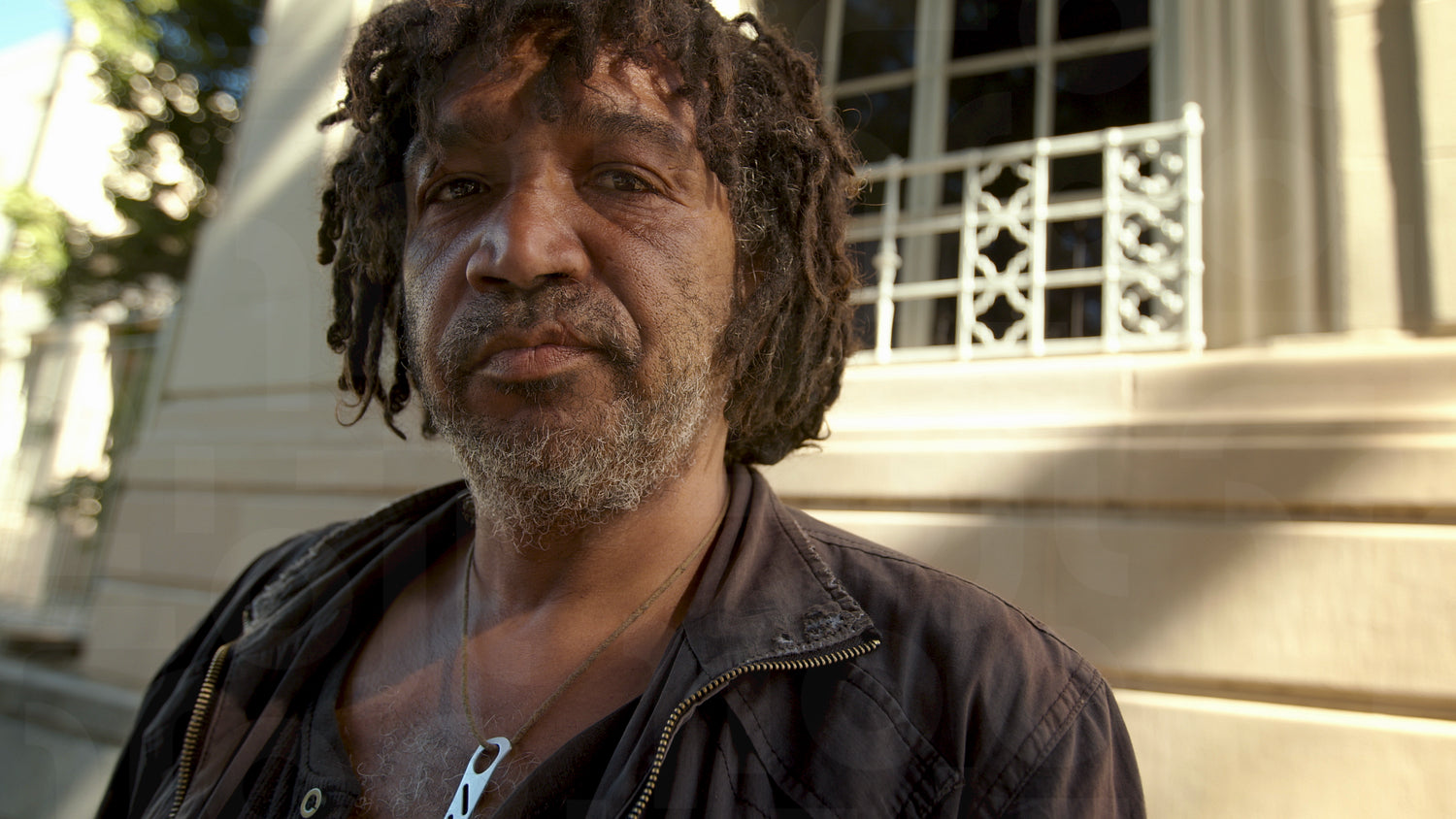 Homeless person portrait. Closeup of a senior man with dreadlocks and gray beard looking at camera while standing outside.