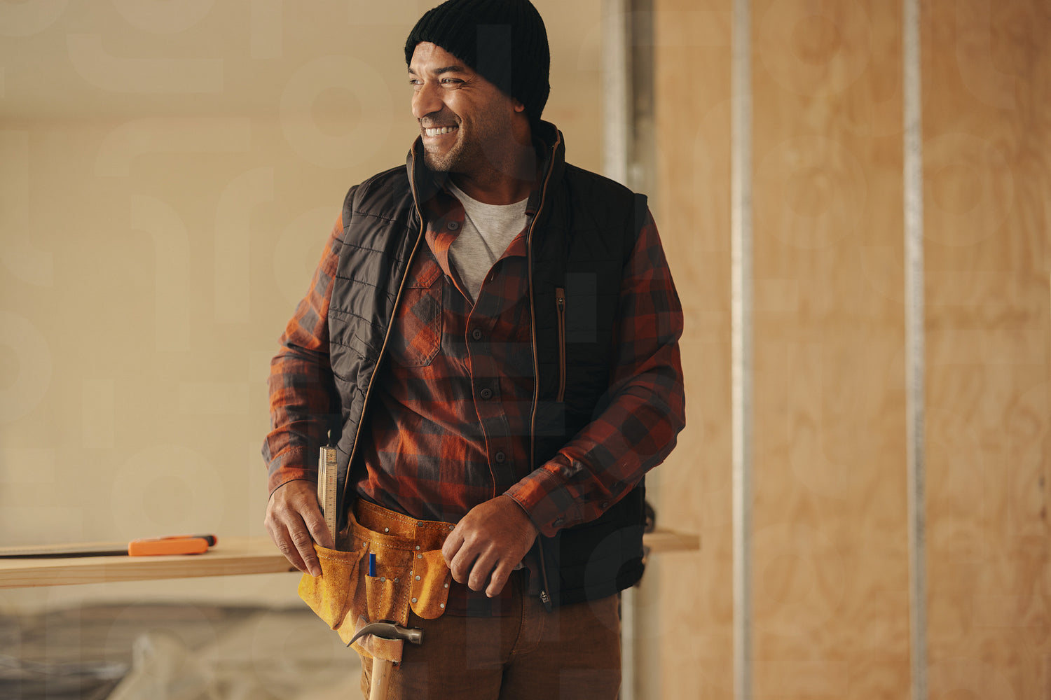 Happy, mature man with a tool belt renovates a house, improving the home for its owner. With expertise and a smile, he upgrades the interior, showcasing his skills as a DIY enthusiast.