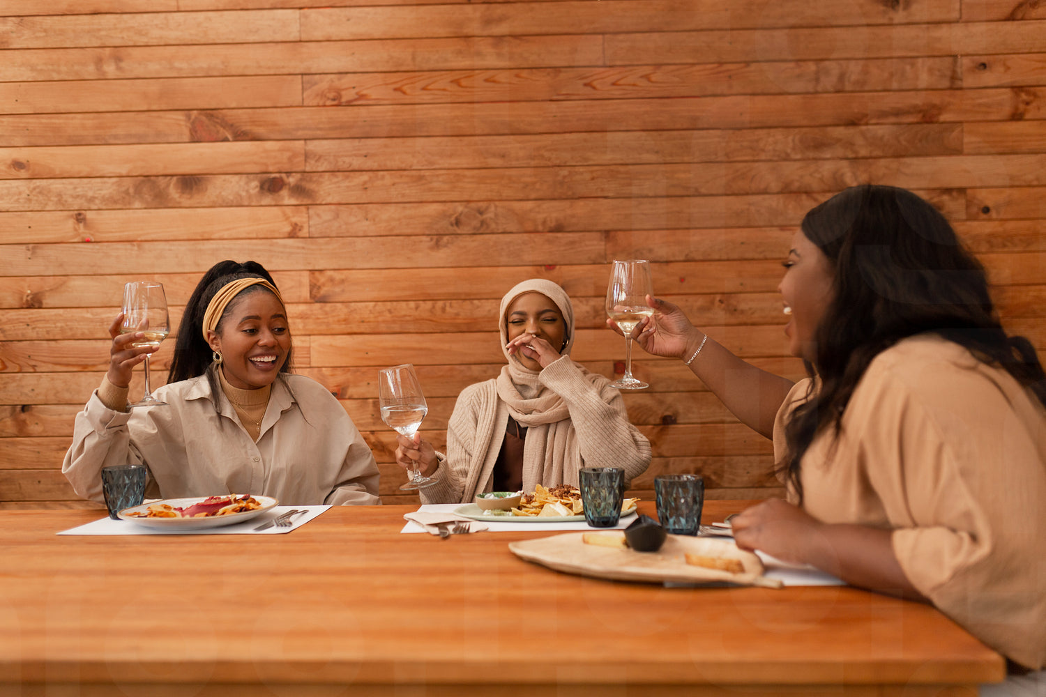 I propose a toast. Three happy female friends celebrating with drinking glasses in a restaurant. Three multicultural young women enjoying a leisurely lunch together on the weekend.