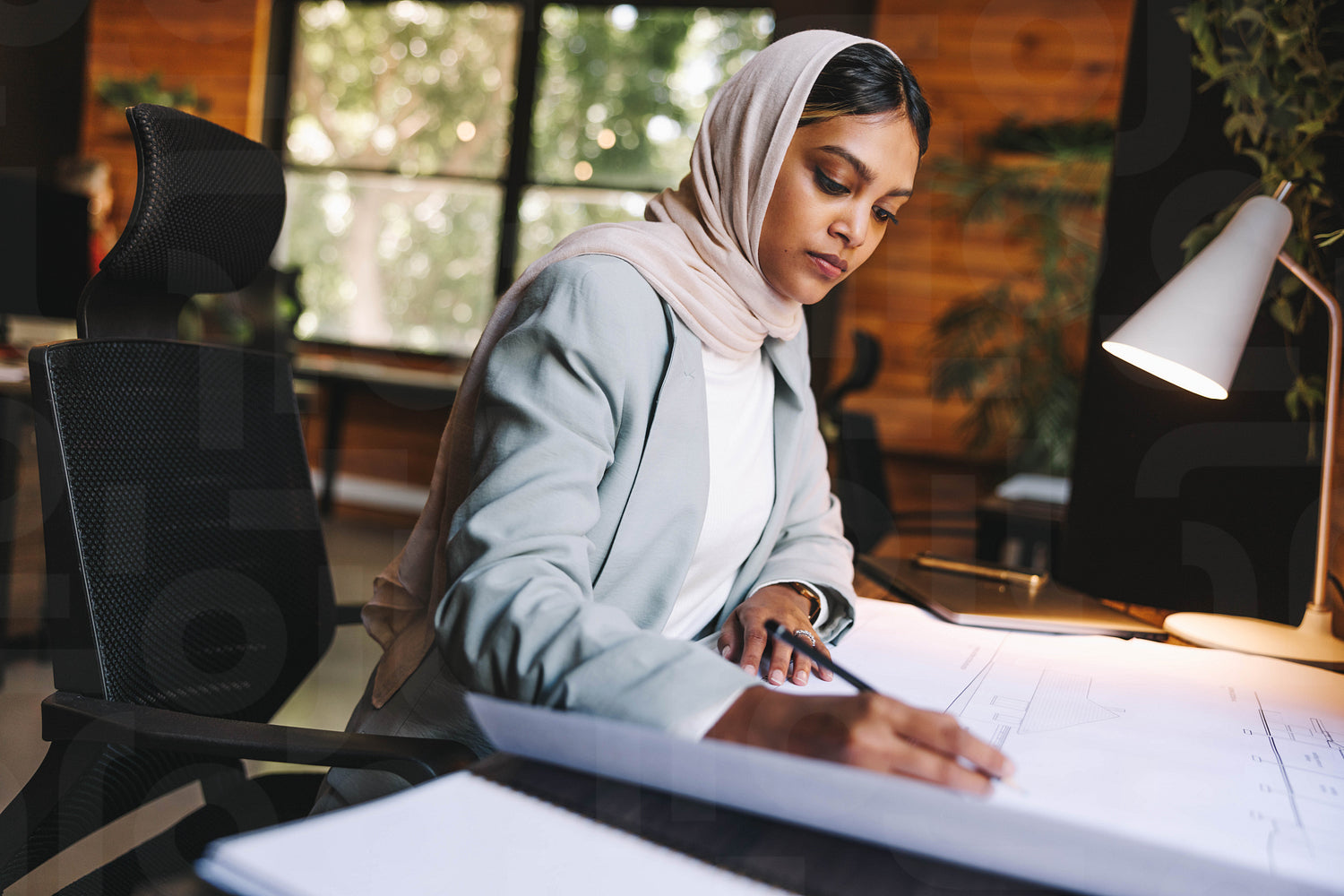 Innovative Muslim designer working with blueprint drawings in a modern office. Young female architect planning a creative project. Ethnic businesswoman wearing a hijab in an inclusive workplace.