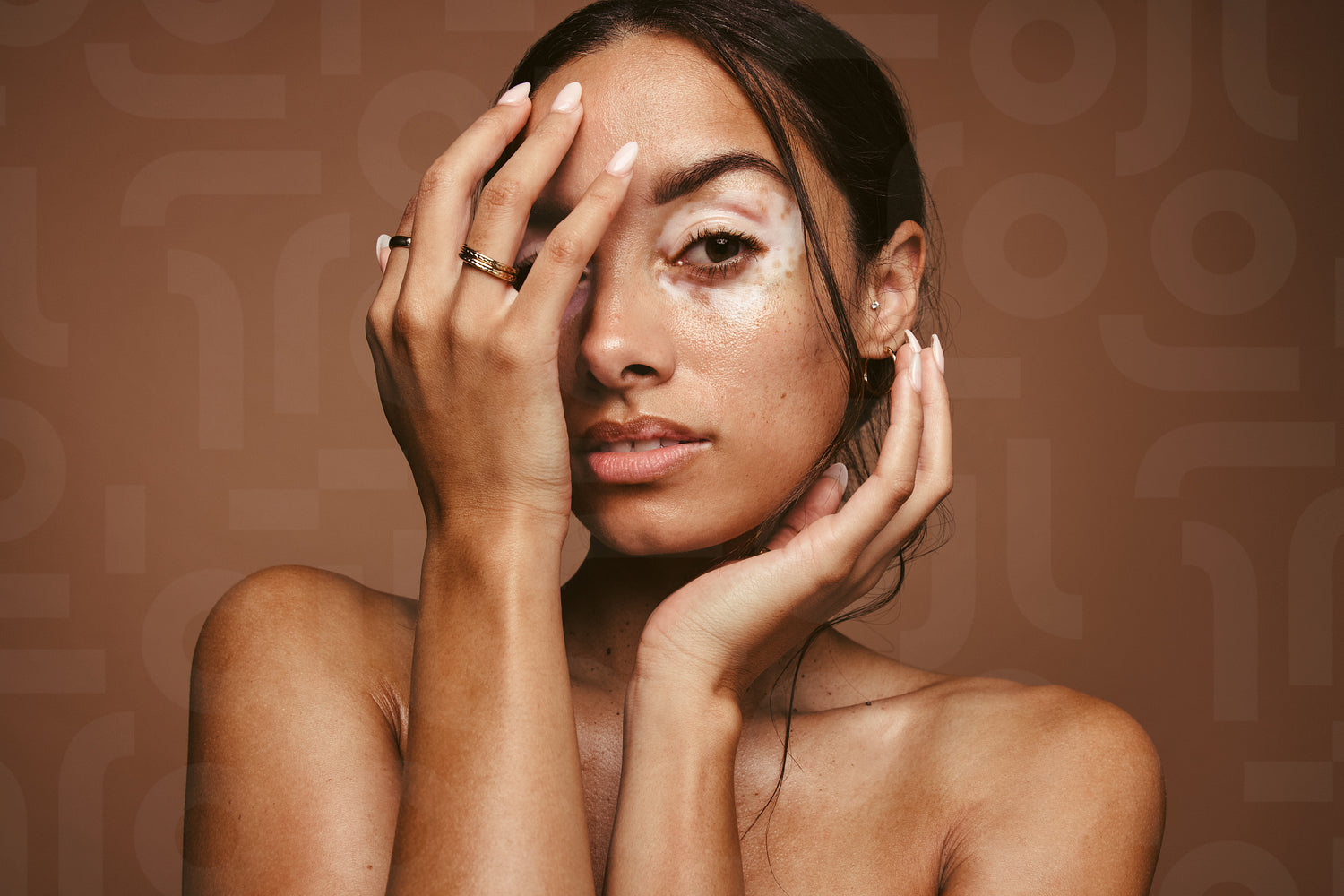 Portrait of young woman with vitiligo on brown background. Close up of woman with skin condition covering her face with hand.