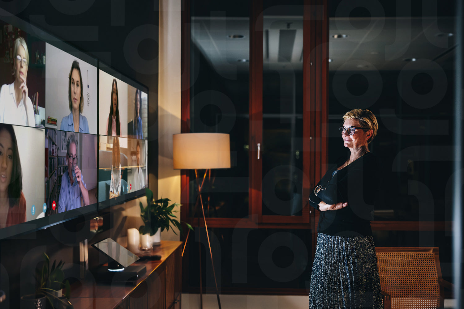 Multi-ethnic business team doing a video call at night. International team doing conference call.