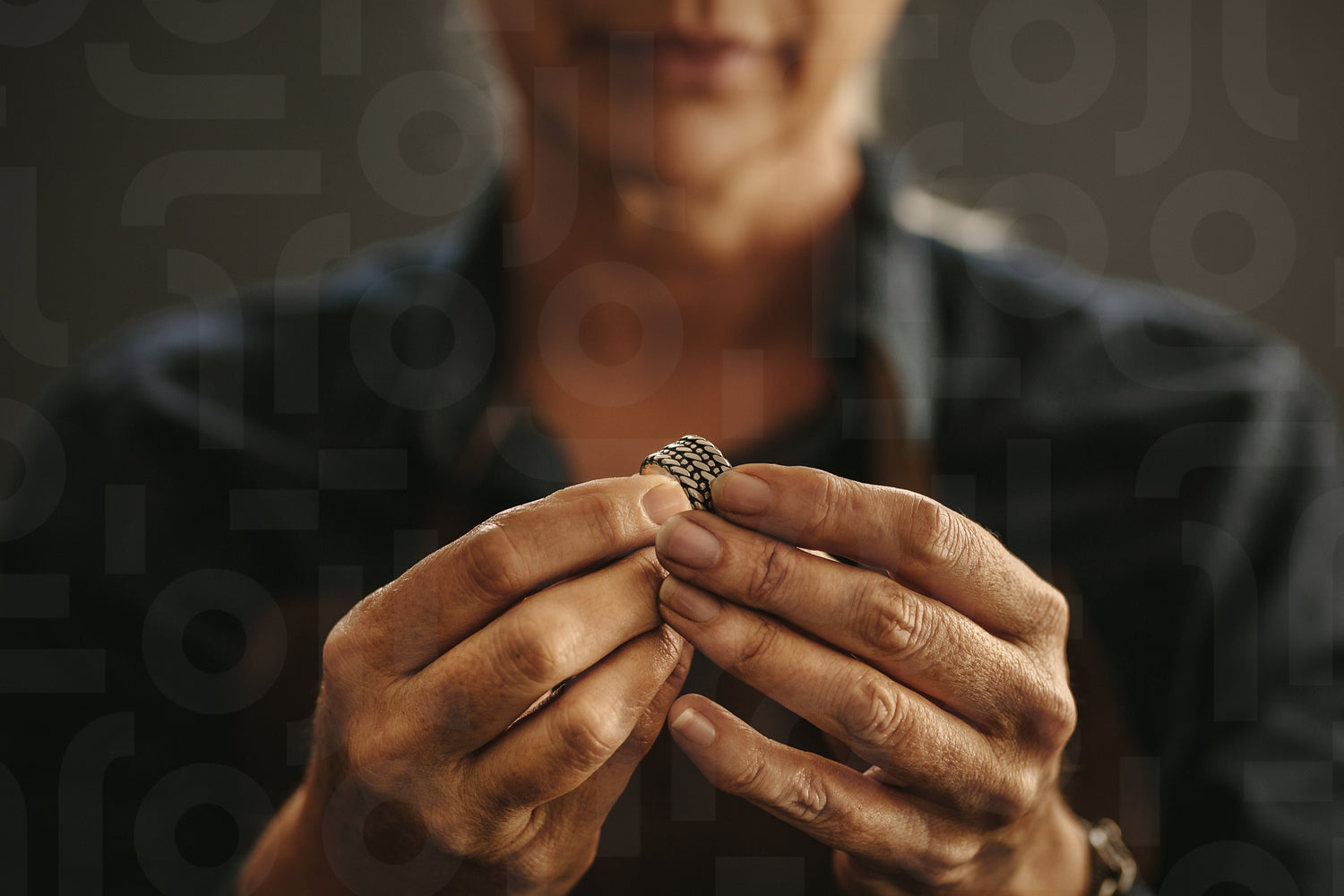 Close up of female jeweler hands examining ring at workshop. Focus on woman jewelry maker hands inspecting a silver ring.