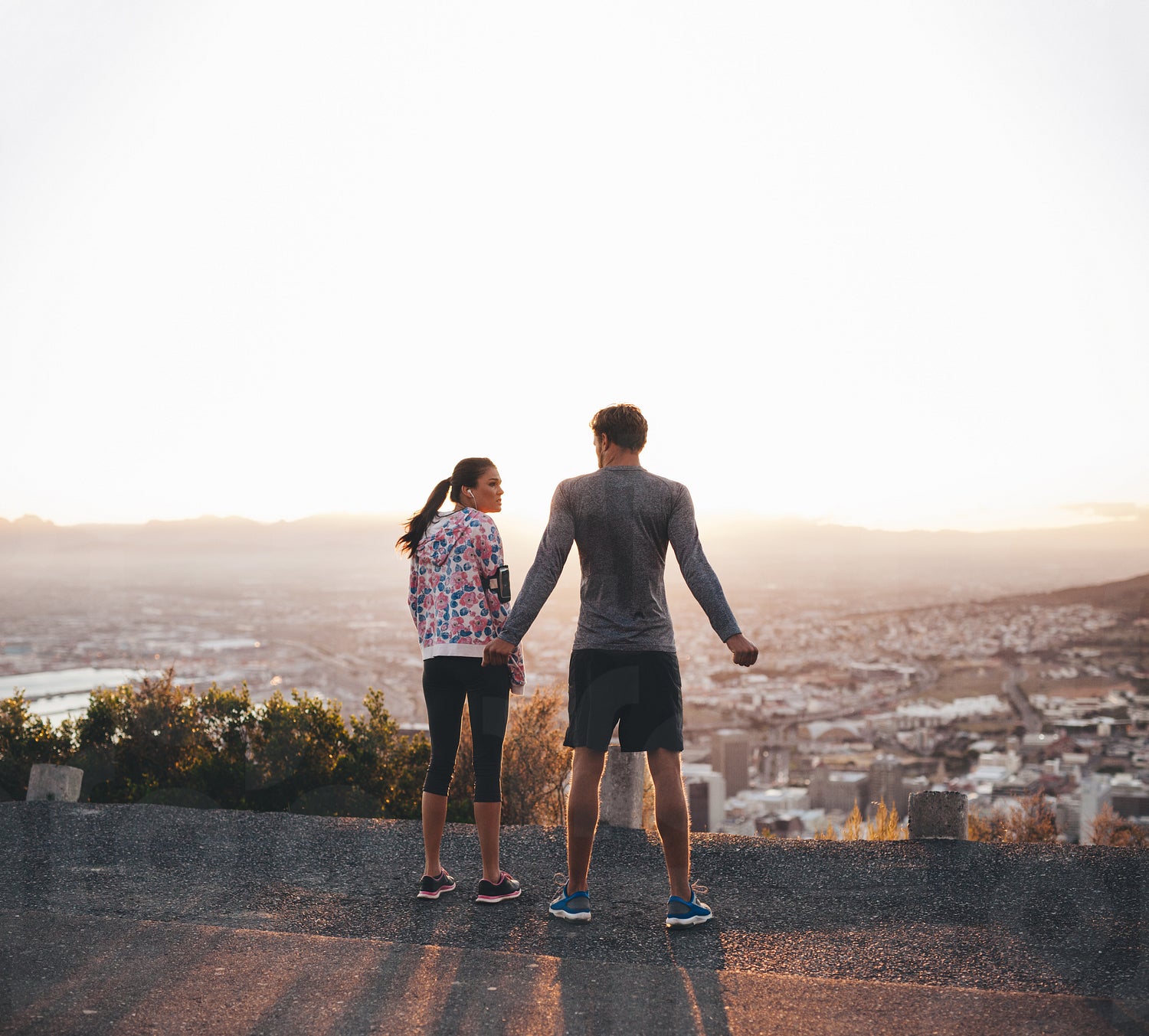 Rear view of a young couple standing together at sunrise. Joggers on hillside in morning.