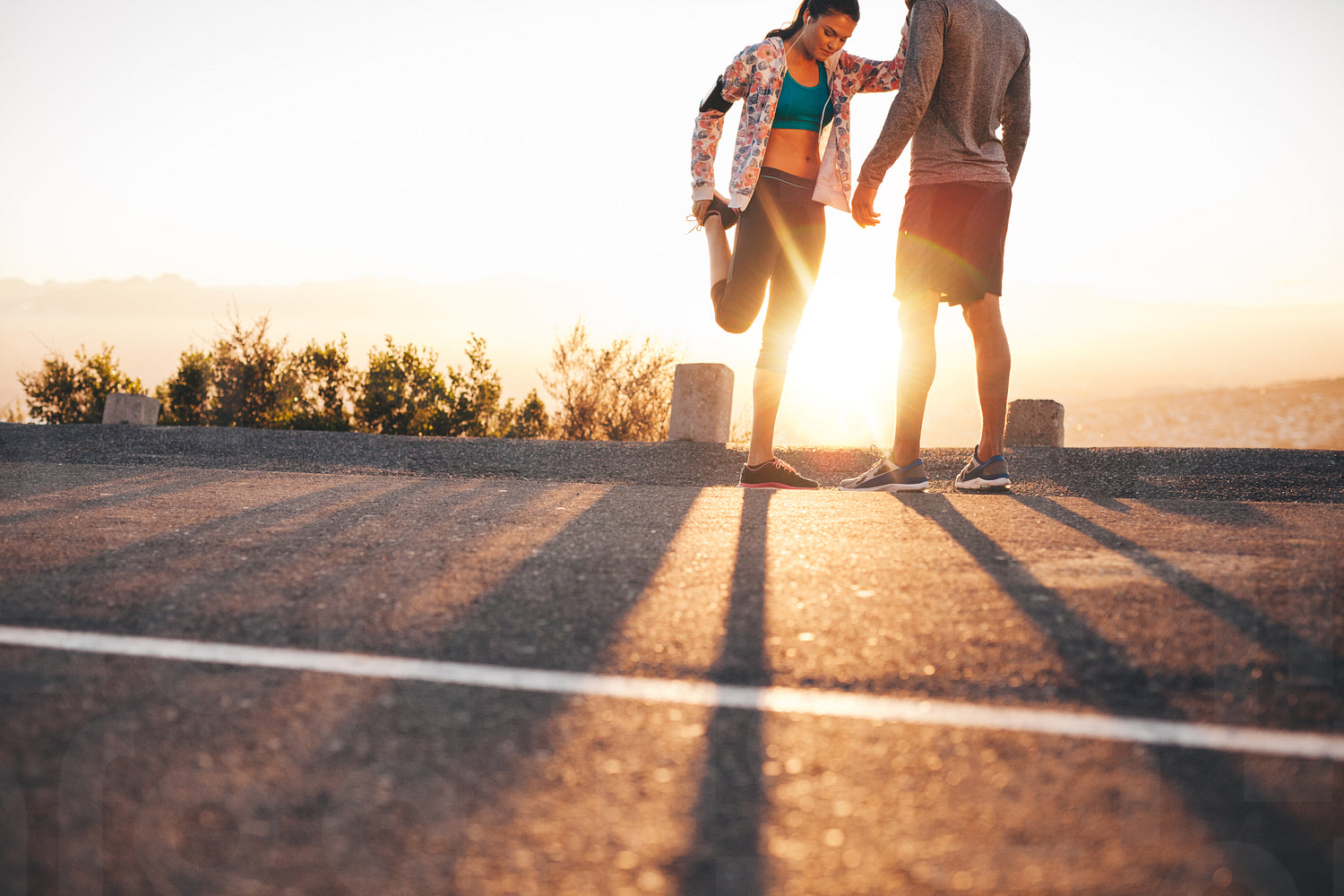 Outdoor shot of young joggers stretching before a run in morning. Young man standing and woman stretching her legs at sunrise.