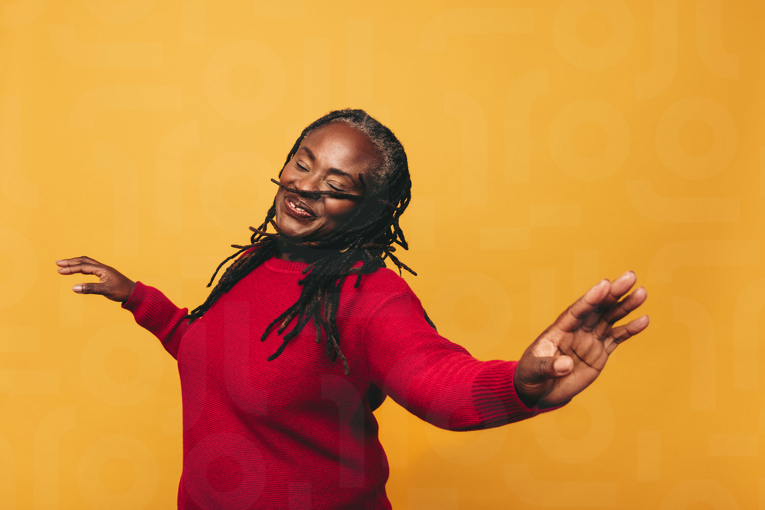 Joyful mature woman dancing and having fun while standing against a yellow background. Happy black woman with dreadlocks embracing her natural hair with pride.