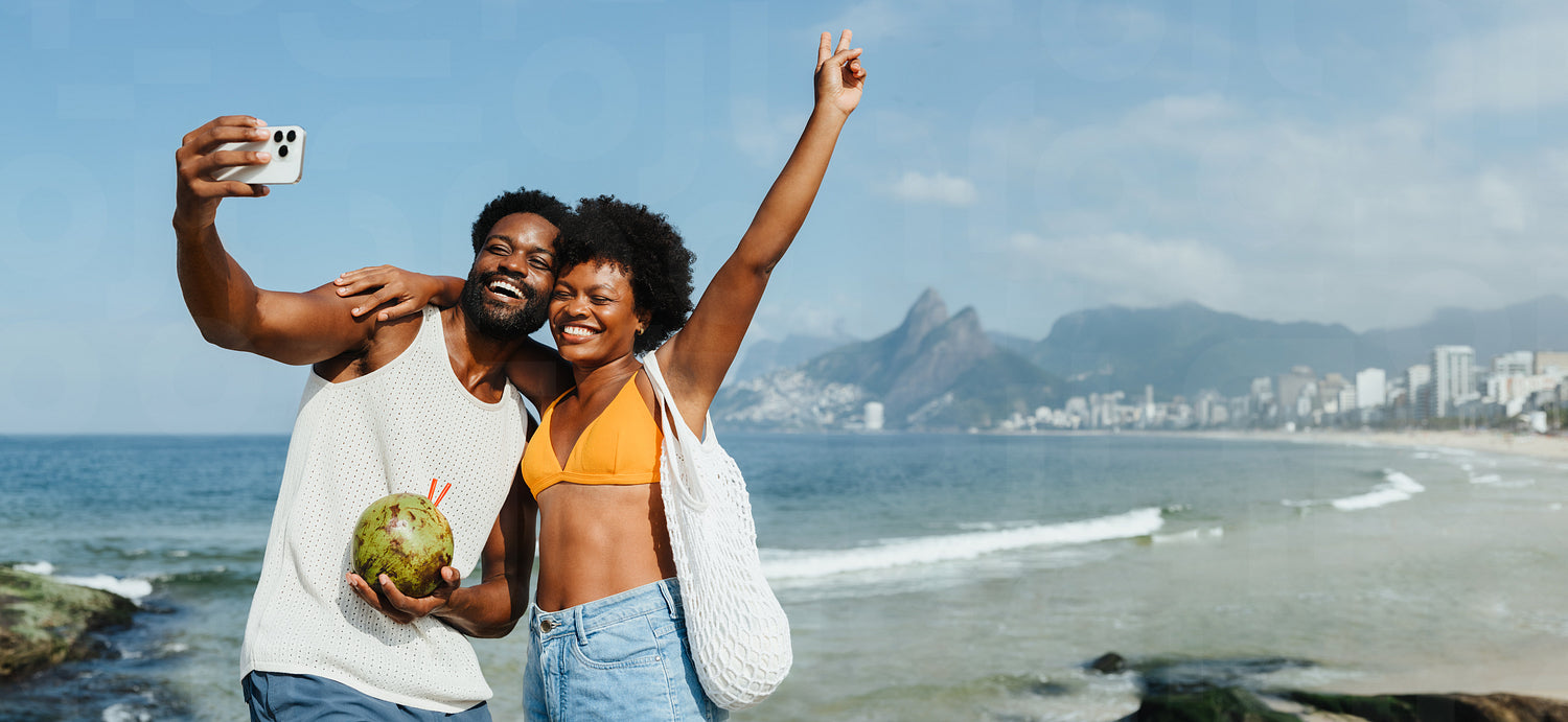 A happy Brazilian couple, possibly newlyweds, enjoy the day at a picturesque beach in Rio de Janeiro. Smiling joyously, they capture the moment with a selfie, surrounded by stunning coastal scenery