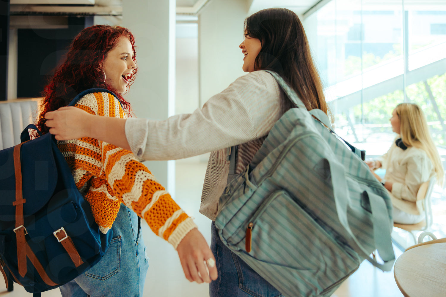 Joyful classmates greeting each other in a sunny school hallway with backpacks and friendly smiles