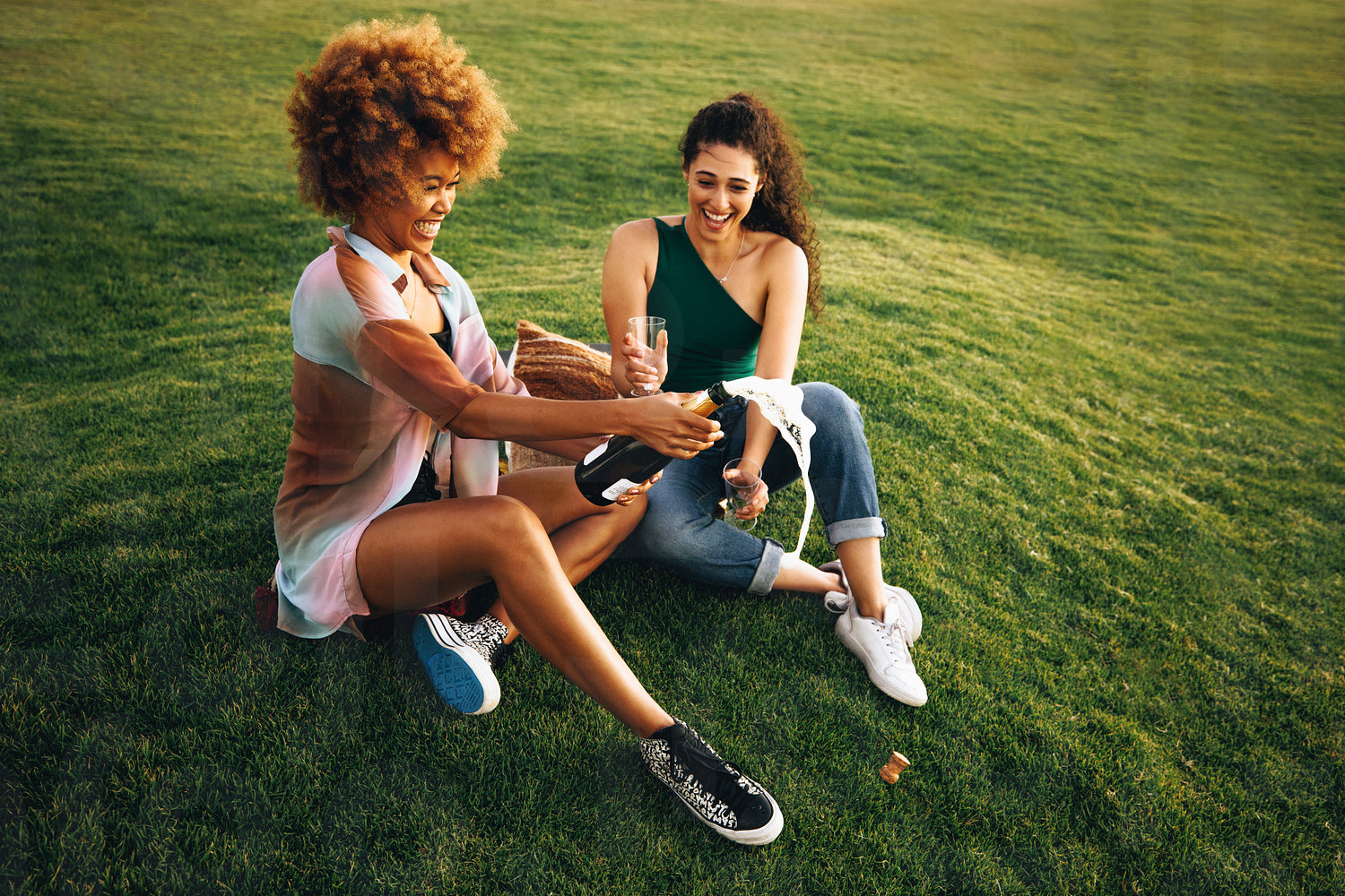 Two college friends celebrate with champagne, sitting on grass and enjoying a sunny day outdoors with laughter and joy.