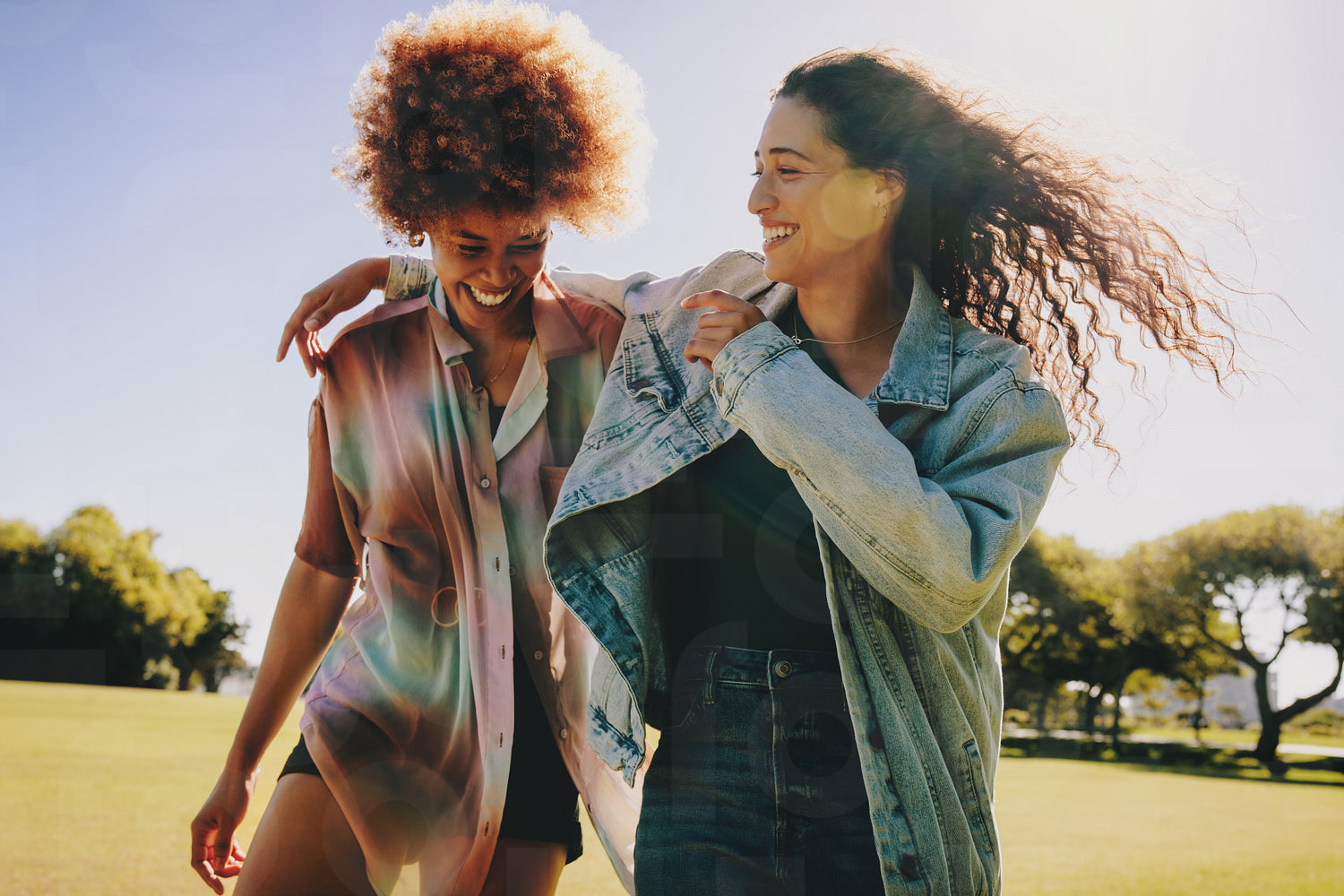 Joyful college girls having fun in a sunny urban park, sharing laughter and happiness on a bright day