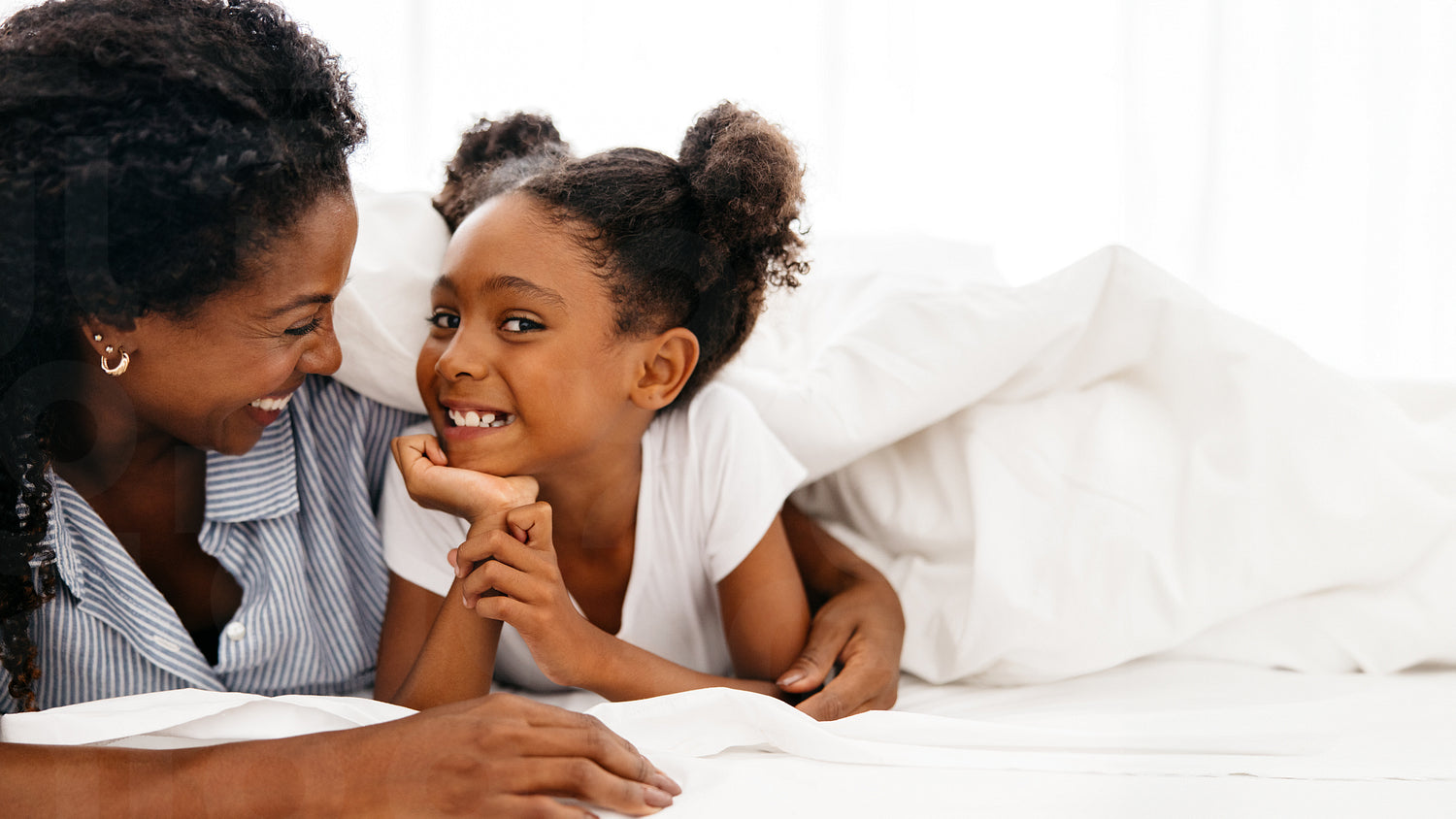 Black mother and her young daughter bond together in bed, smiling and hugging.