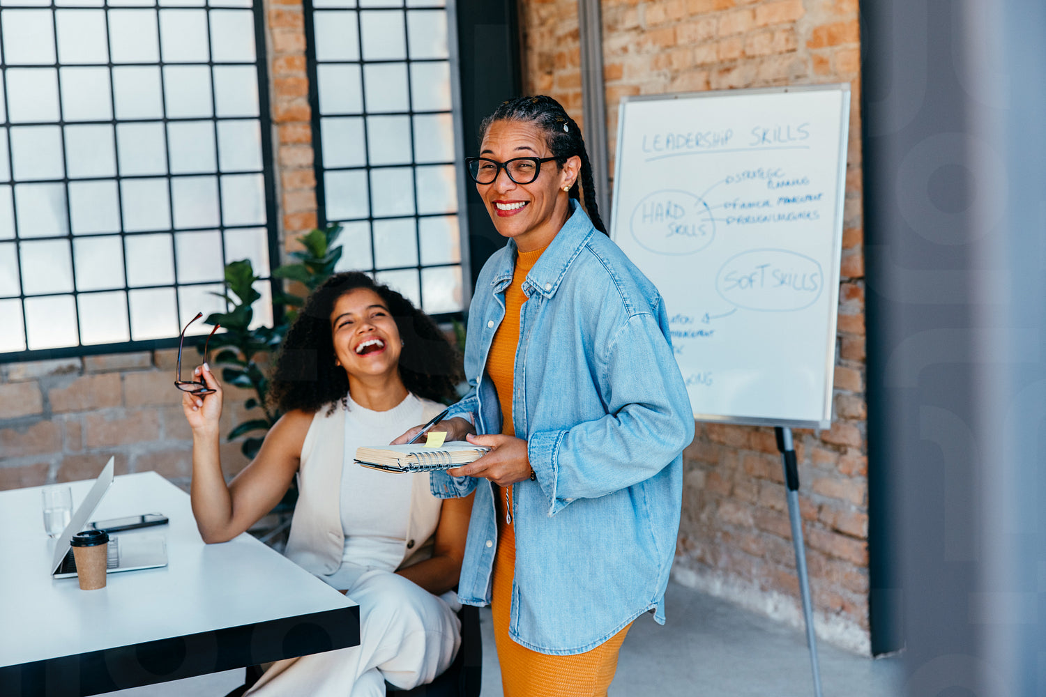 Joyful professionals laughing and collaborating in a business meeting, highlighting leadership skills and teamwork in a sleek corporate atmosphere.