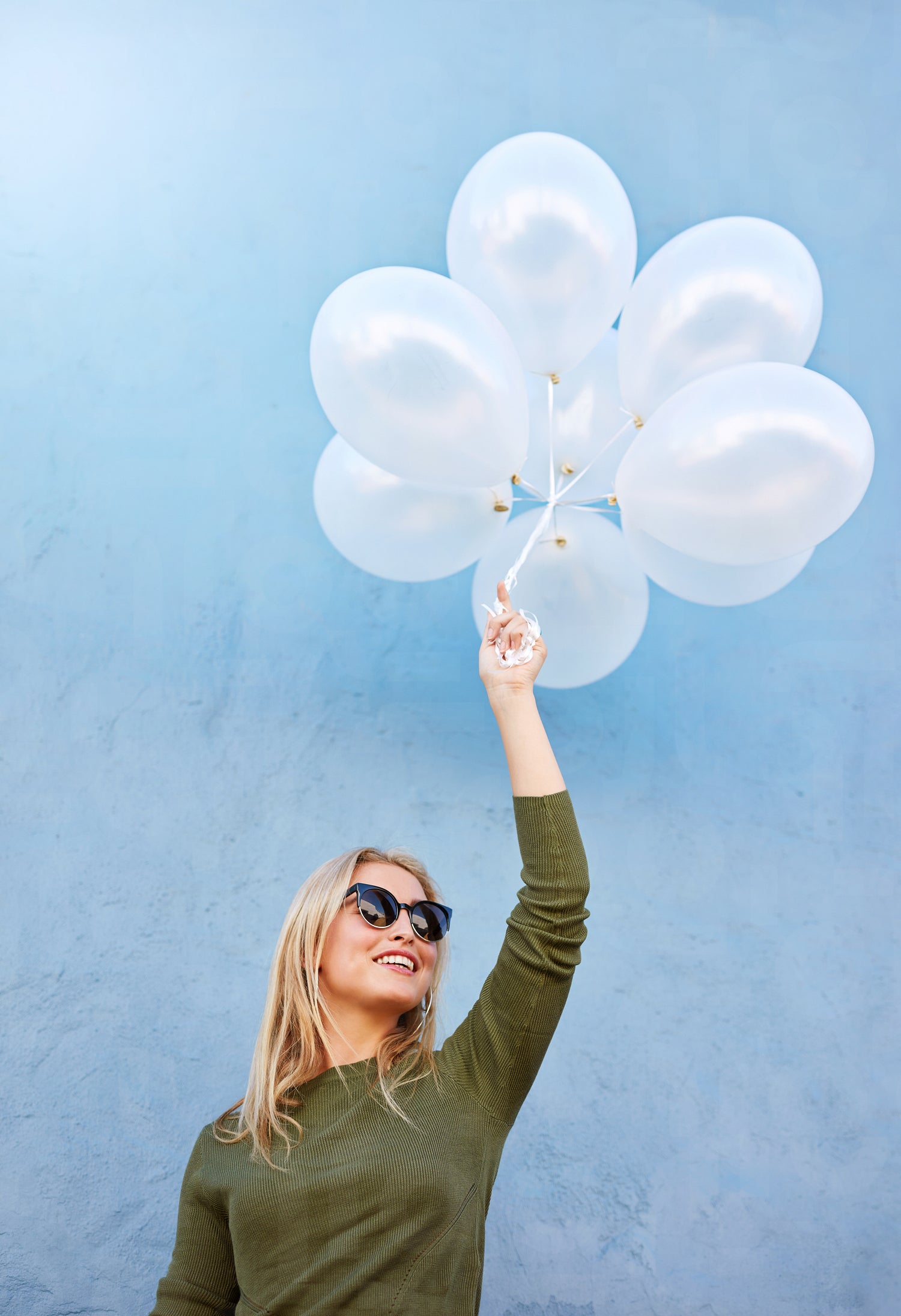Shot of joyous young female model with balloons. Caucasian woman in sunglasses against blue background.