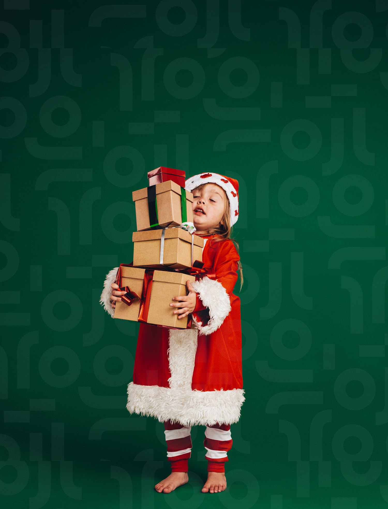 Kid in santa costume holding a pile of gift boxes. Little girl in santa claus dress carrying gift boxes.