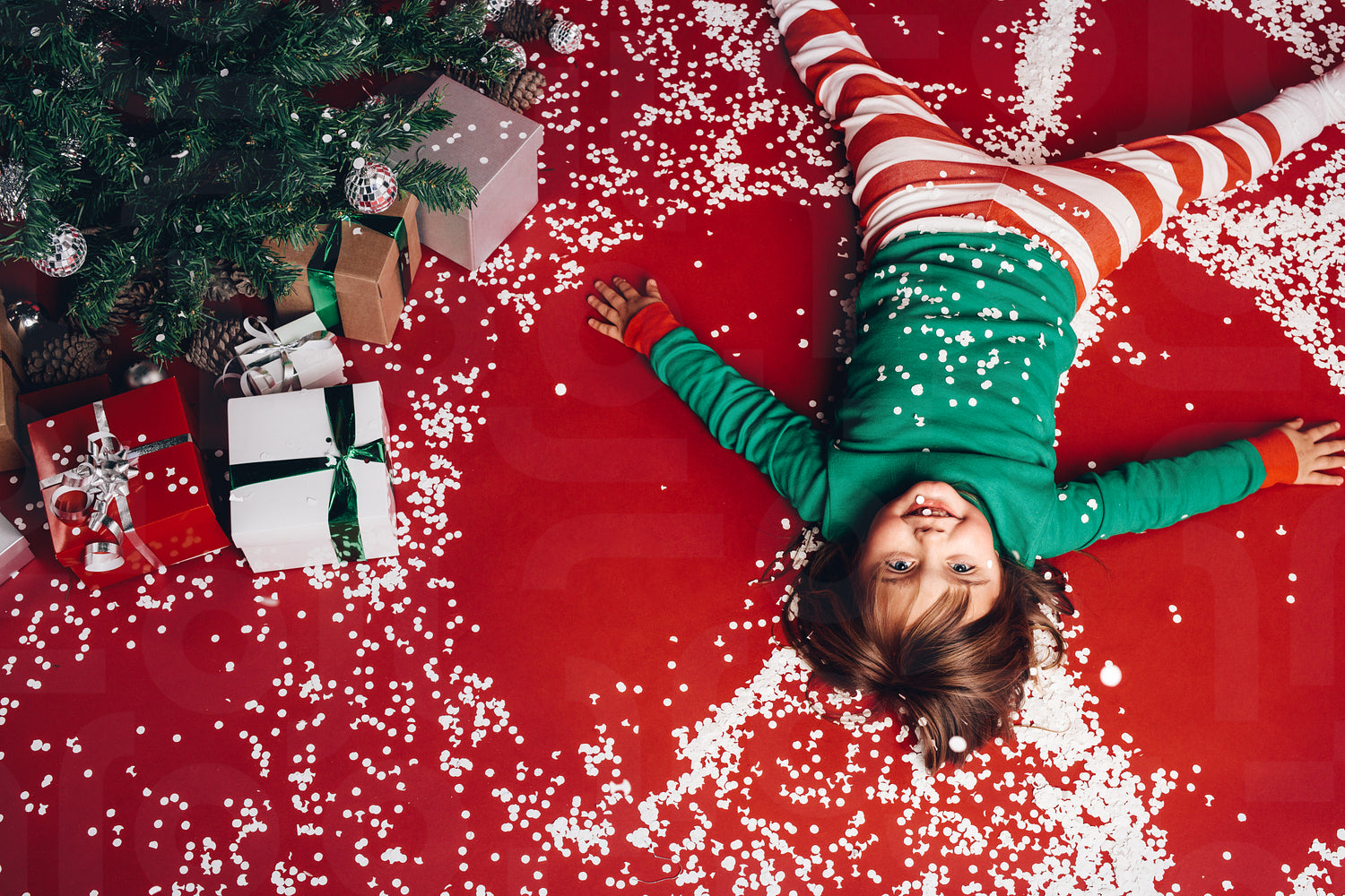 Top view of a kid lying on floor with artificial snow flakes all over the place. Little girl having fun lying on the floor beside a christmas tree
