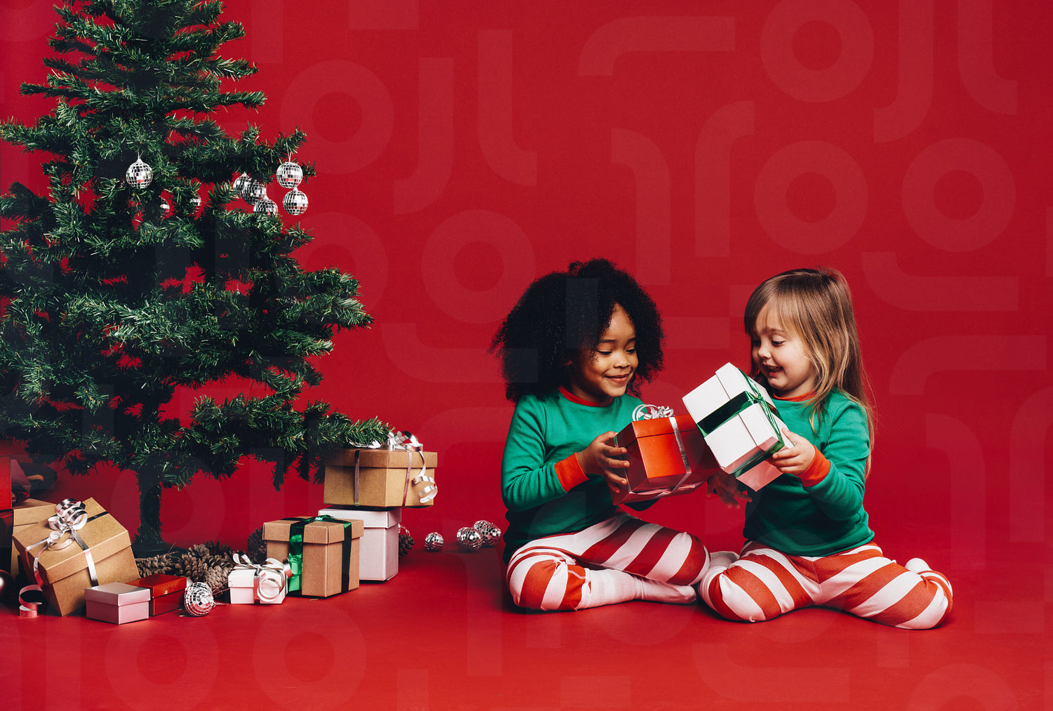 Little girls sitting beside a christmas tree playing with their gift boxes. Kids exchanging christmas gifts with a decorated christmas tree and gift boxes in the background.