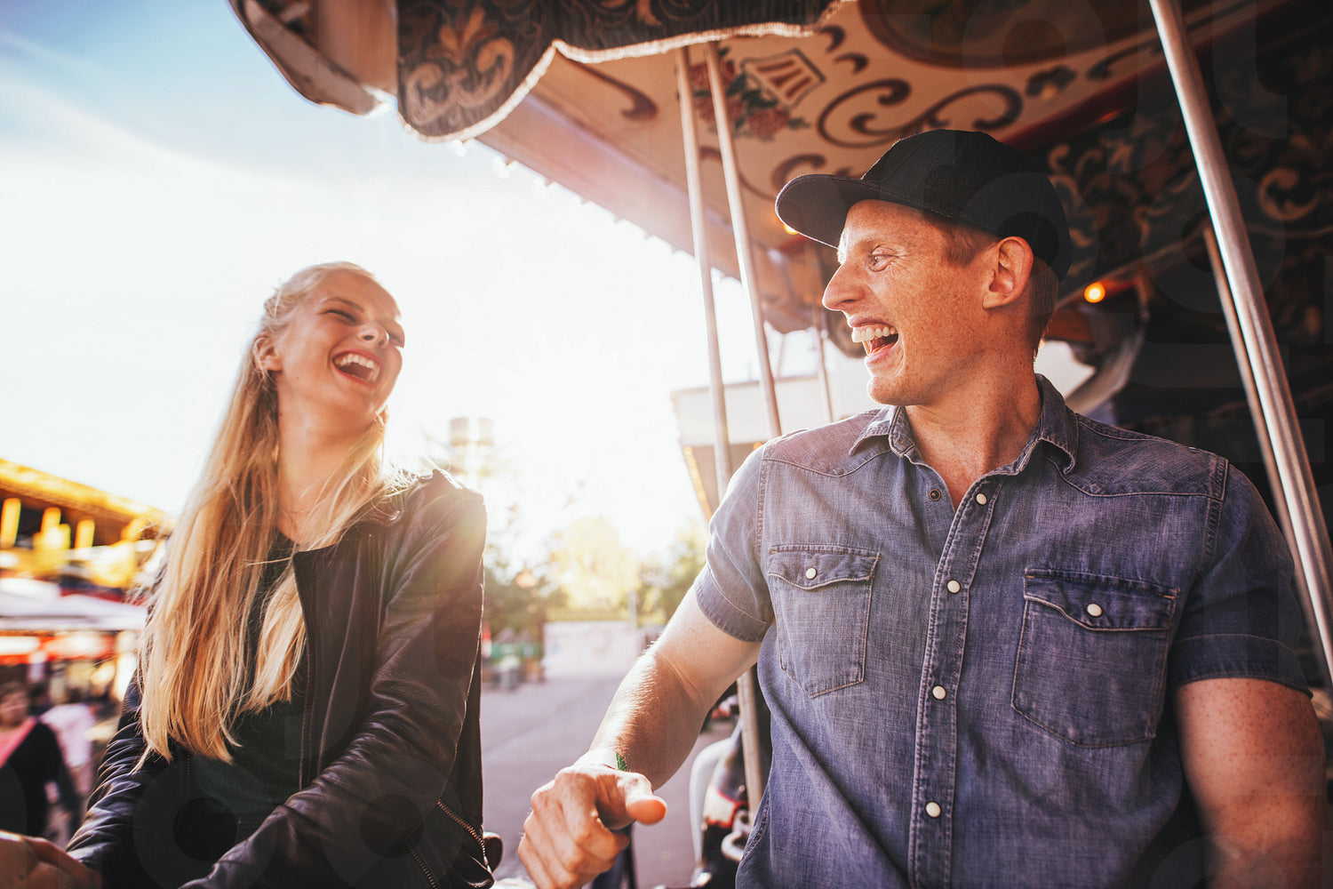Laughing young friends riding on carousel in amusement park. Smiling couple on carousel ride.