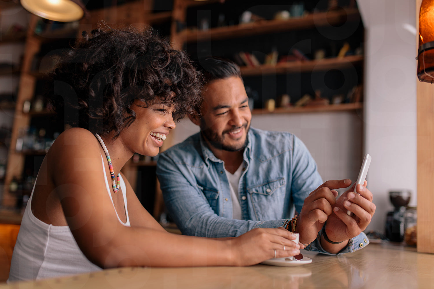 Young happy couple sitting at table in cafe and looking at mobile phone and smiling. African woman and caucasian man in coffee shop using smart phone.