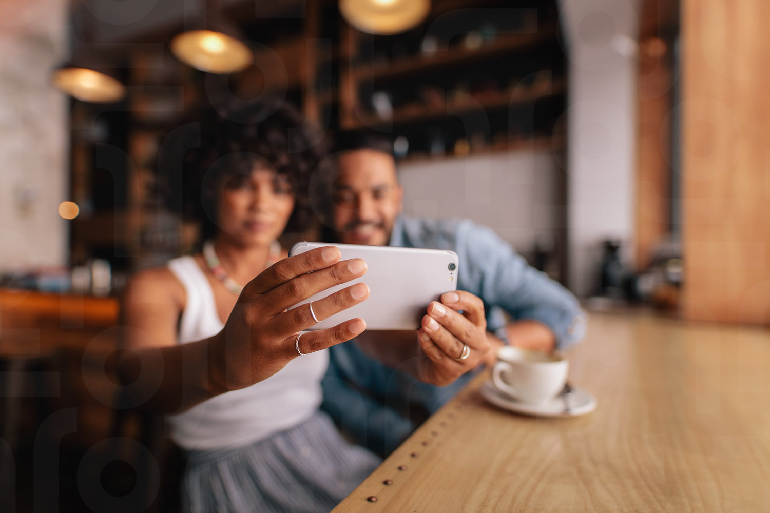Close up of female hands holding mobile phone and taking self portrait. Young woman taking selfie with smart phone while sitting at cafe with her boyfriend.