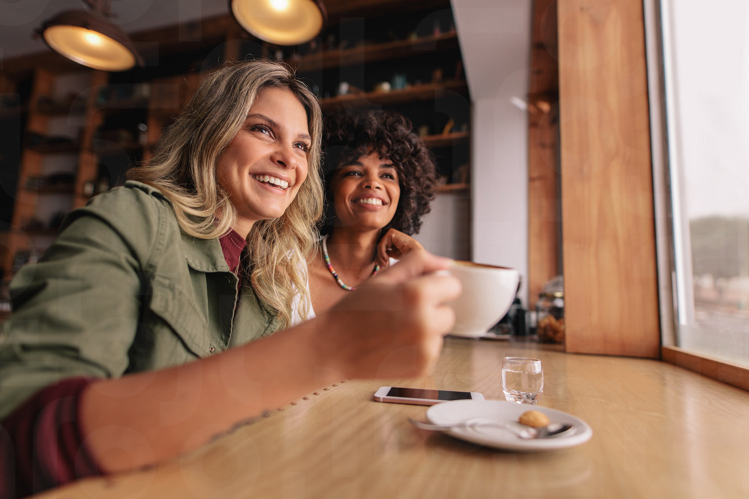 Two young woman sitting at cafe and having coffee. Female friends drinking coffee at restaurant.