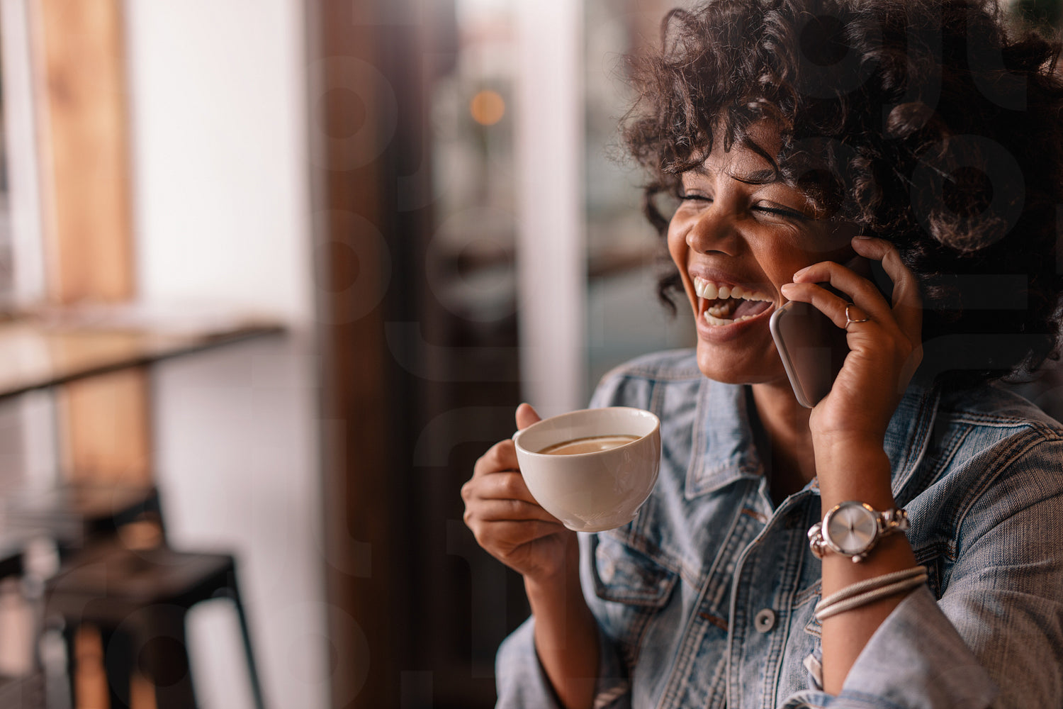 Cheerful young woman talking on phone and smiling while enjoying coffee in cafe. African female using mobile phone in a coffee shop.