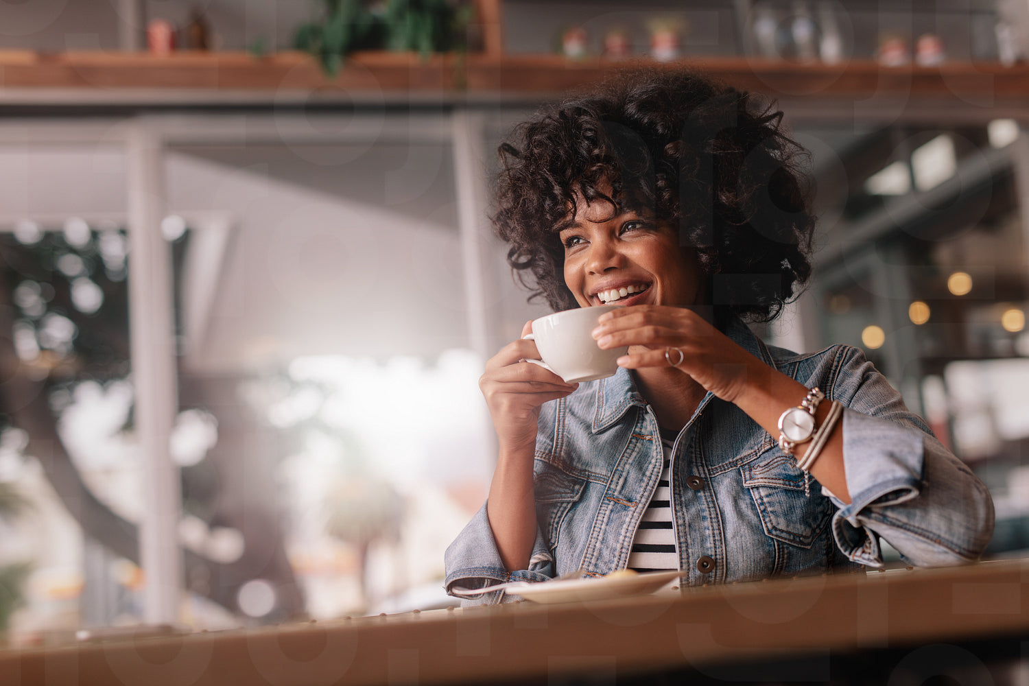 Portrait of beautiful young african woman sitting in a cafe and drinking coffee. Smiling young female having coffee in a restaurant.
