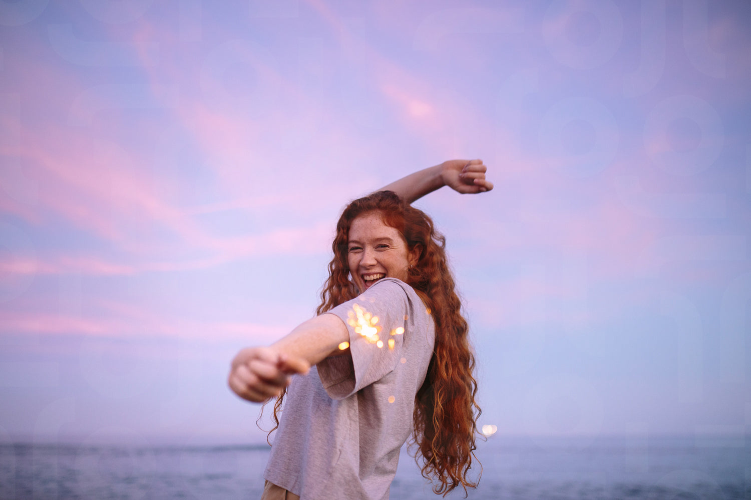 Lighting things up at the beach. Happy young woman dancing and laughing while holding a sparkling light in her hand. Cheerful young woman celebrating with bengal lights at the beach.