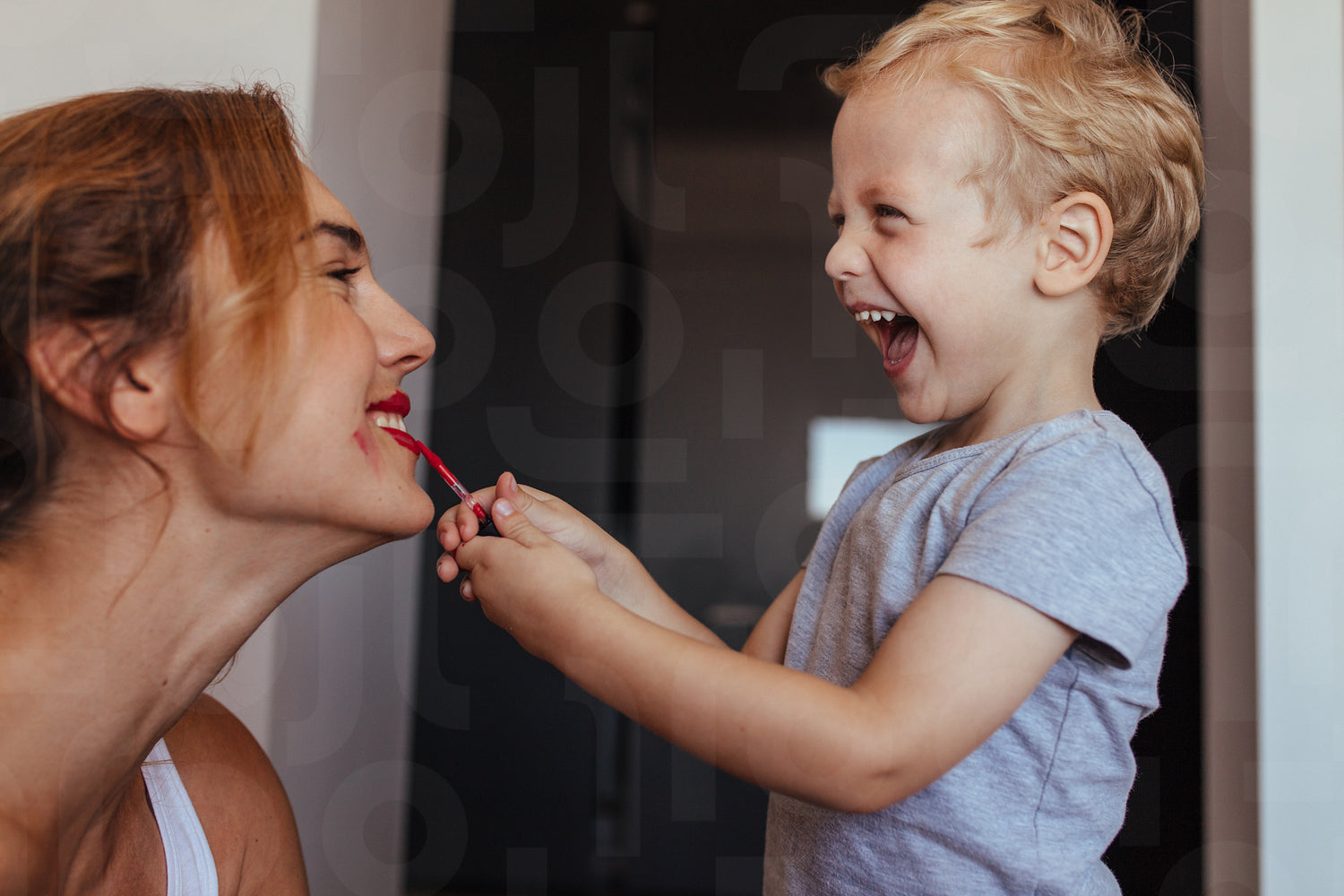Smiling little boy putting on the makeup to her mother. Happy mother and son playing with makeup at home.