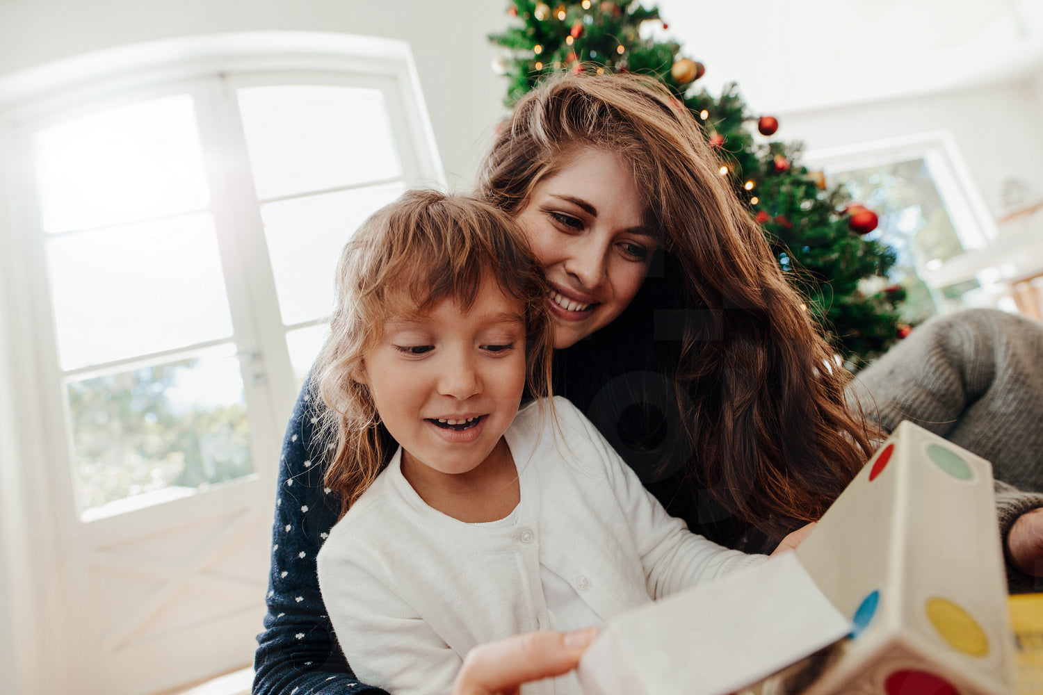 Mother and daughter opening Christmas gift. Family celebrating Christmas at home.