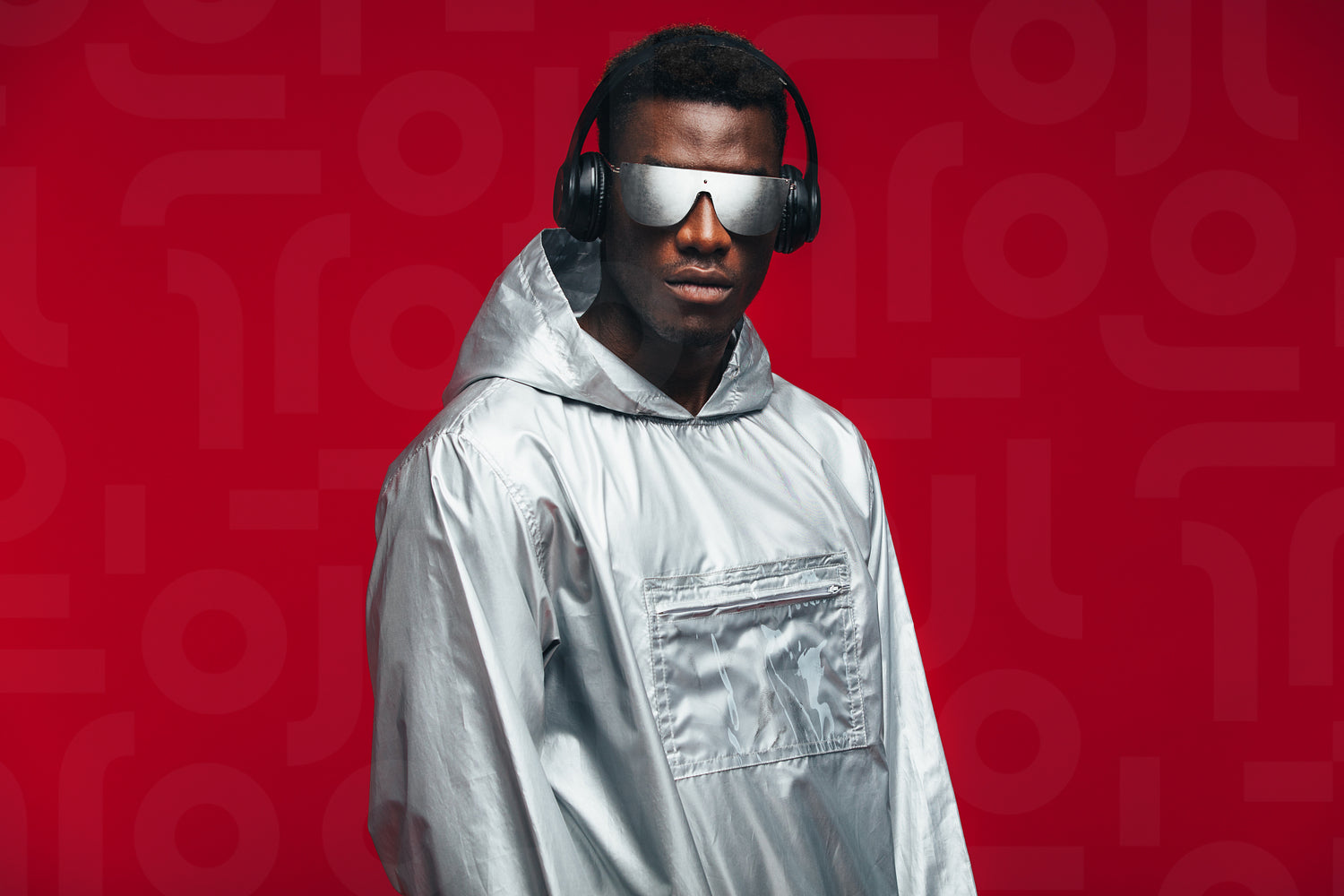 Stylish african man wearing a silver hooded shirt, sunglasses and headphones against red background. Funky young african american guy.
