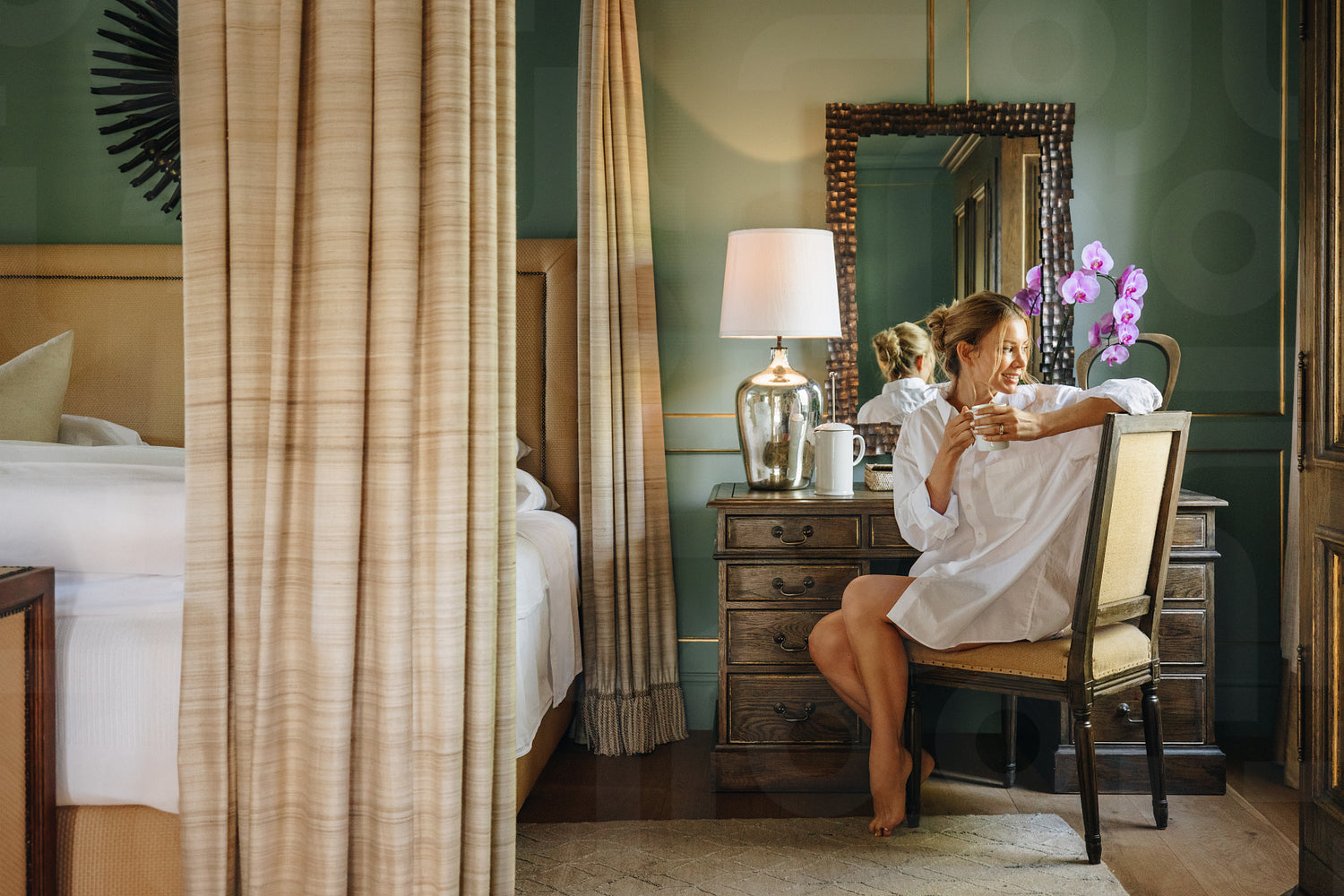 Looking at the outdoor views. Attractive young woman looking outdoors with a smile on her face while sitting on a chair and holding a cup of coffee. Young woman enjoying her holiday in a luxury hotel.