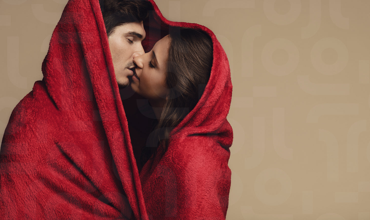 Loving young couple kissing under a red blanket. Young man and woman wrapped in a blanket and kissing on brown background.