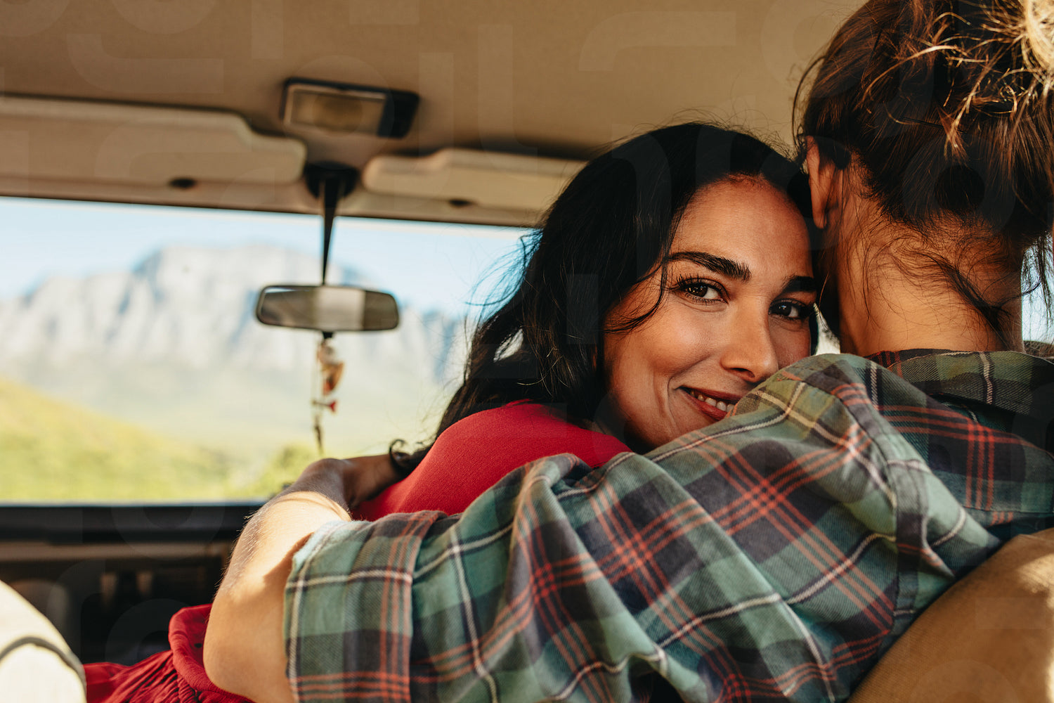 Beautiful woman embracing her boyfriend driving a car. Loving couple on a road trip.