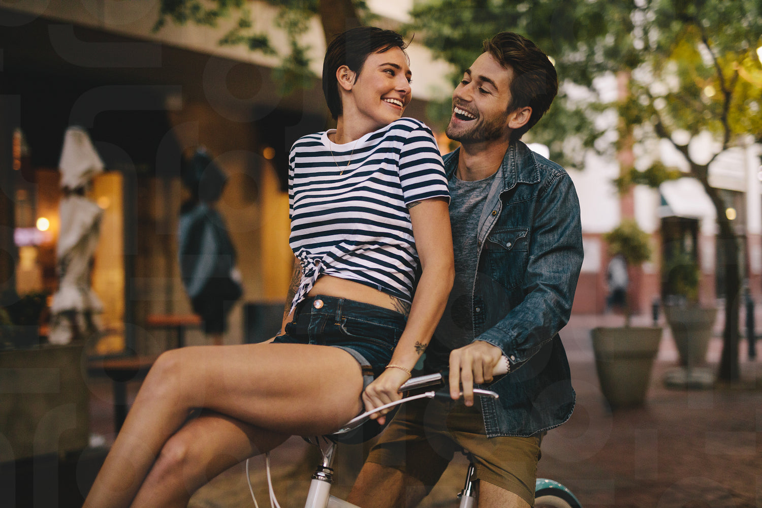 Beautiful young woman sitting on boyfriends bicycle handlebar and smiling. Romantic couple on a bike together in the city.