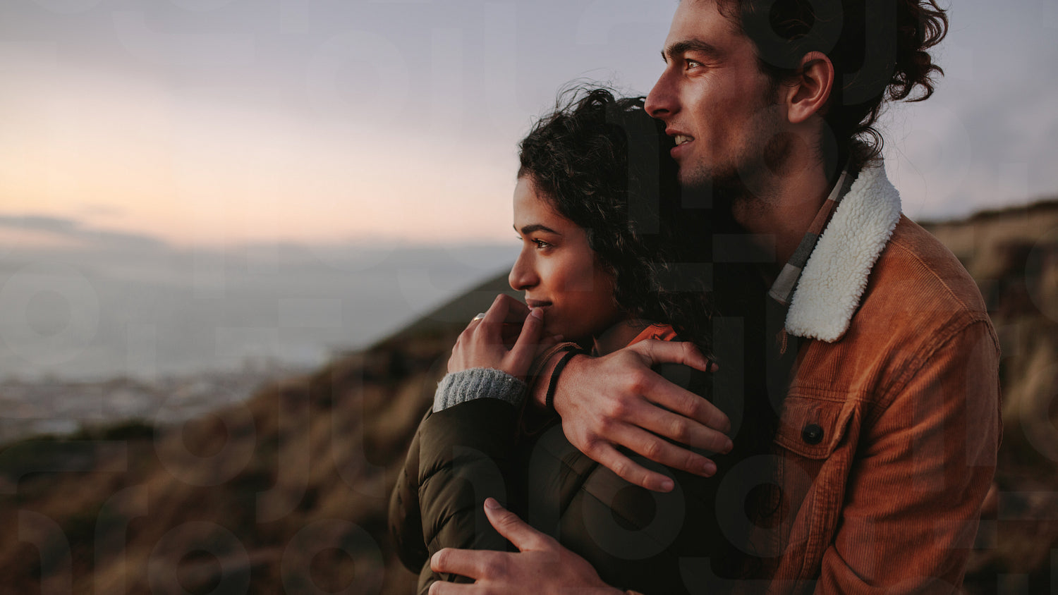 Side view of affectionate couple embracing and looking away. Man and woman together on mountain looking at a view.