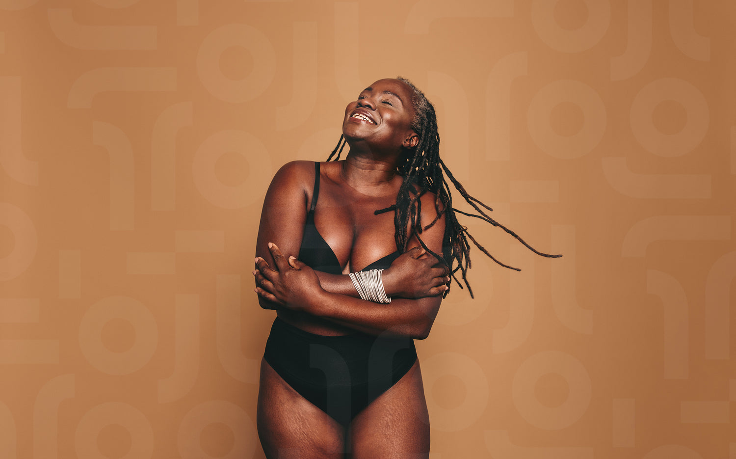 Loving my natural body. Happy woman with dreadlocks embracing her natural and ageing body. Mature black woman smiling cheerfully while standing against a studio background in black underwear.