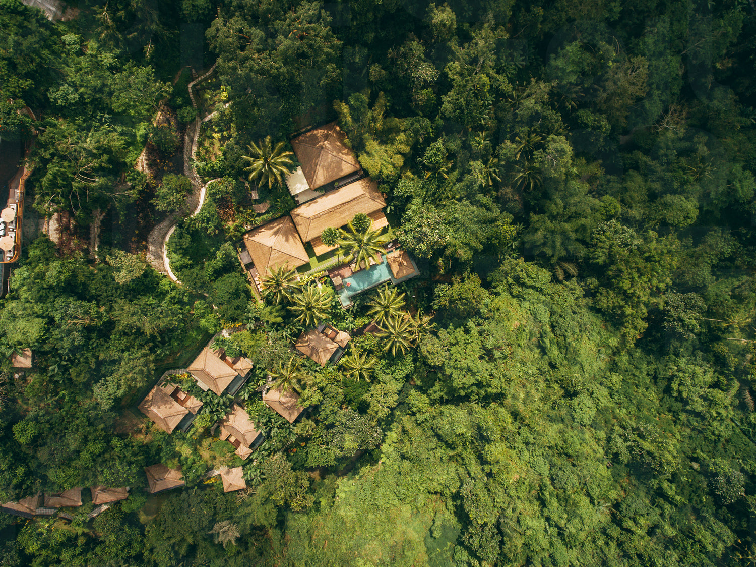 Bird's eye view of luxury resort in forest surrounded by trees.