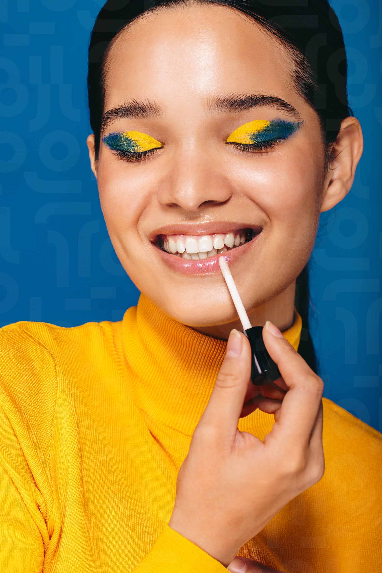 Beautiful woman applying lip gloss in a studio, she smiles with vibrant eyeshadow on her face. Young gen z woman enjoying her makeup routine, feeling confident in her beauty technique and gorgeous look.