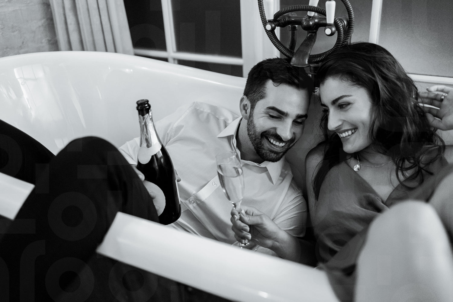 Making a toast in the bathroom. Cheerful young couple toasting with champagne in a hotel bathtub. Romantic young couple celebrating during their honeymoon vacation in a luxury hotel.