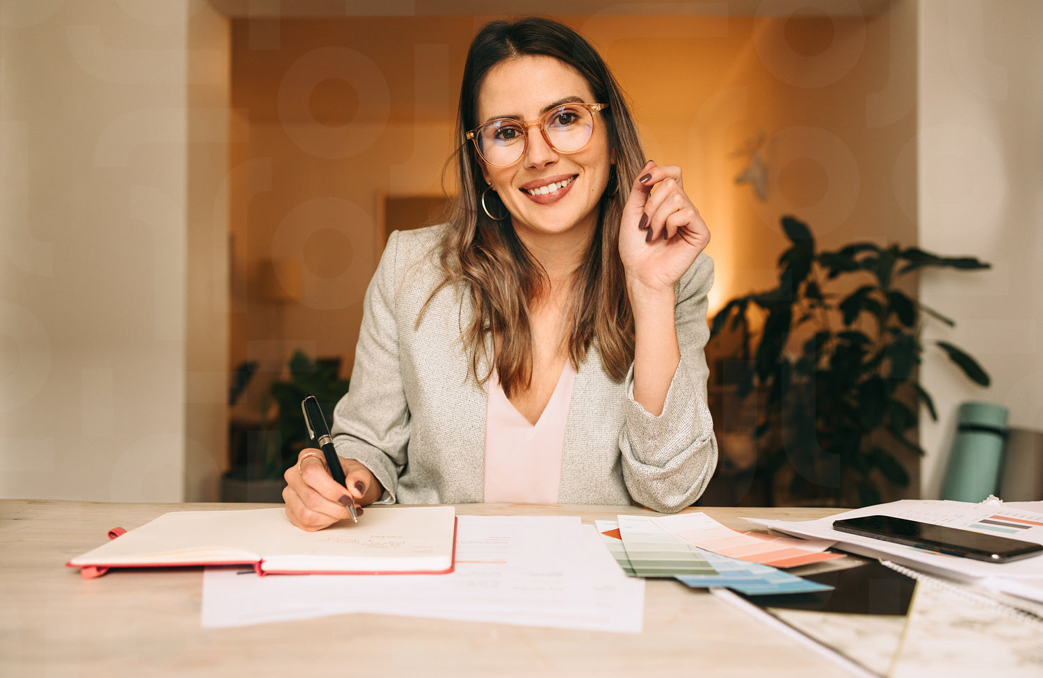 Making important notes during a video call. Happy female designer smiling while attending a virtual meeting with her clients. Creative businesswoman planning a new project in her home office.