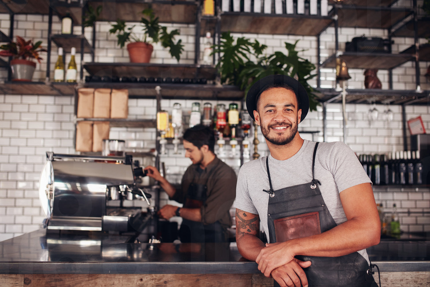 Portrait of male coffee shop owner standing at the counter with barista working in background making drinks.